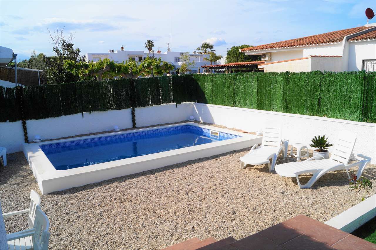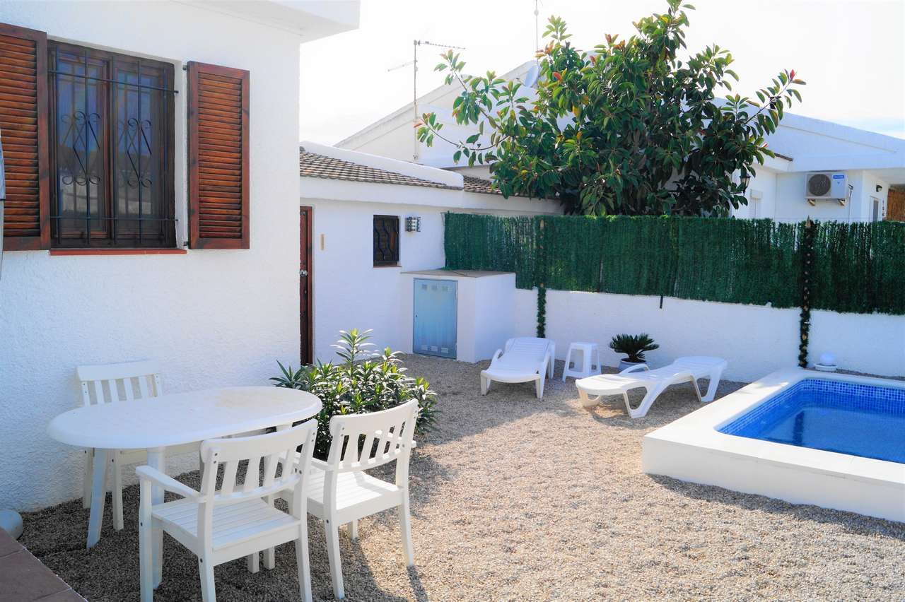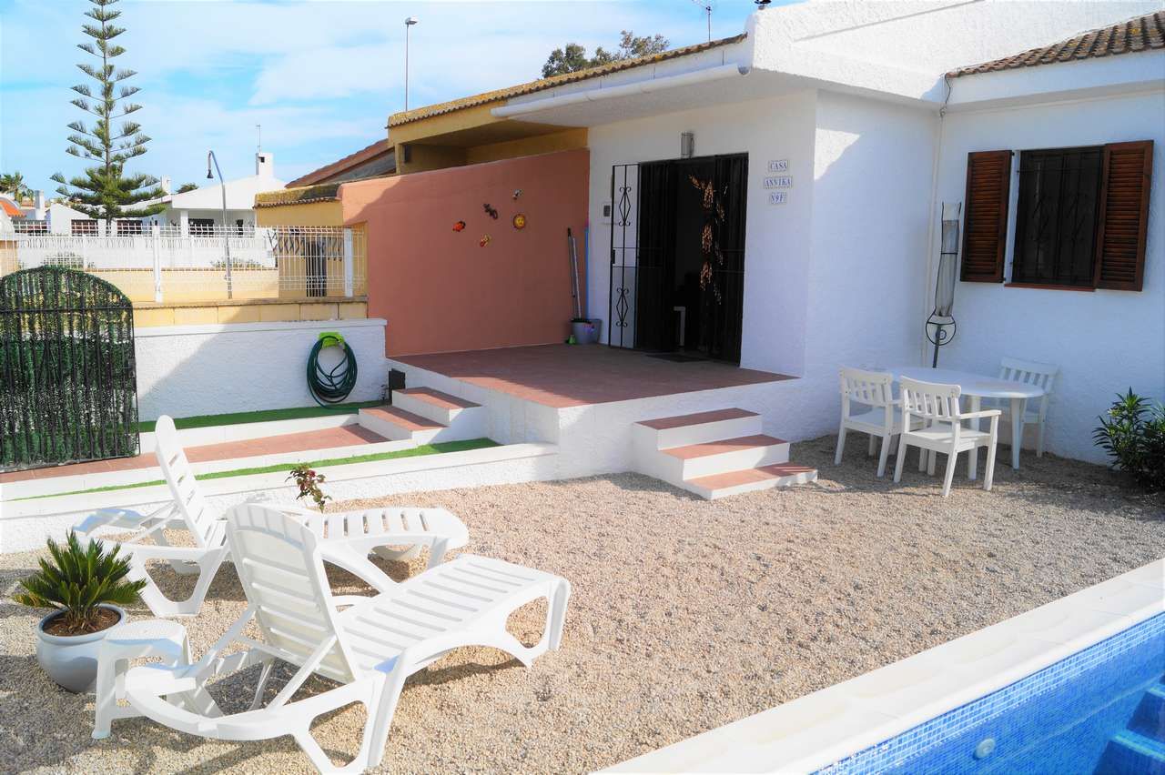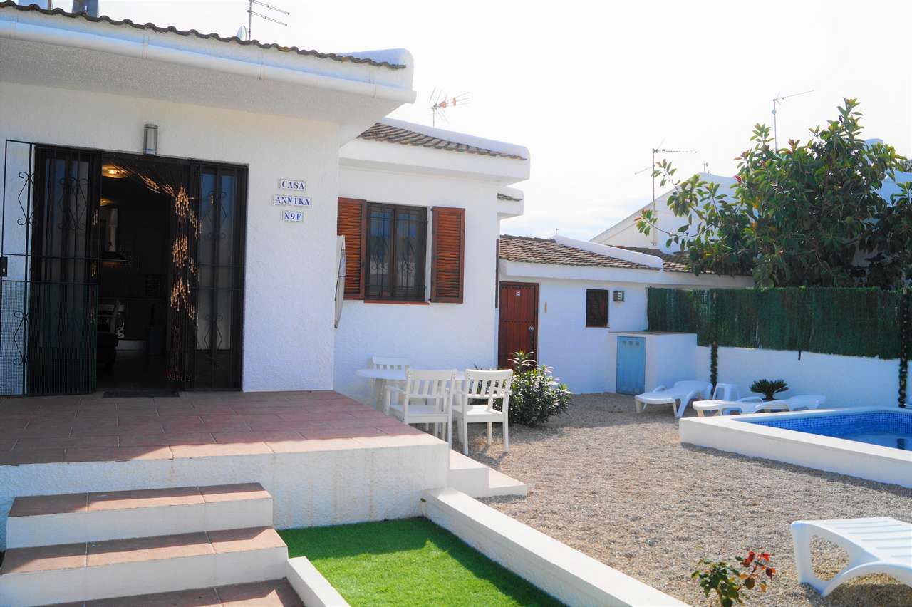 El chalet adosado Annika está equipado para 4 personas y se encuentra a unos 500 metros de la playa. La propiedad está completamente vallada, por lo que una mascota puede moverse libremente por el jardín. Al entrar en la casa que fue completamente renovada en el 2017, al entrar encontrará la sala de estar con sofá, televisión/Sat y aire acondicionado. A continuación, está la mesa de comedor con 2 sillas y un banco, la cocina abierta, está equipada con todos los utensilios de cocina necesarios, vajilla, vitrocerámica, horno eléctrico, lavavajillas, microondas, etc. El pasillo conduce al aseo con ducha, al dormitorio con una cama doble que consta de 2 colchones y al pequeño dormitorio con una cama individual que se puede convertir en una cama doble. Ambos dormitorios disponen de un armario ropero y tienen vistas hacía la piscina. A través del solárium con piscina privada y barbacoa encontraran un pequeño almacén donde pueden guardar las cosas de la playa o equipo deportivo.