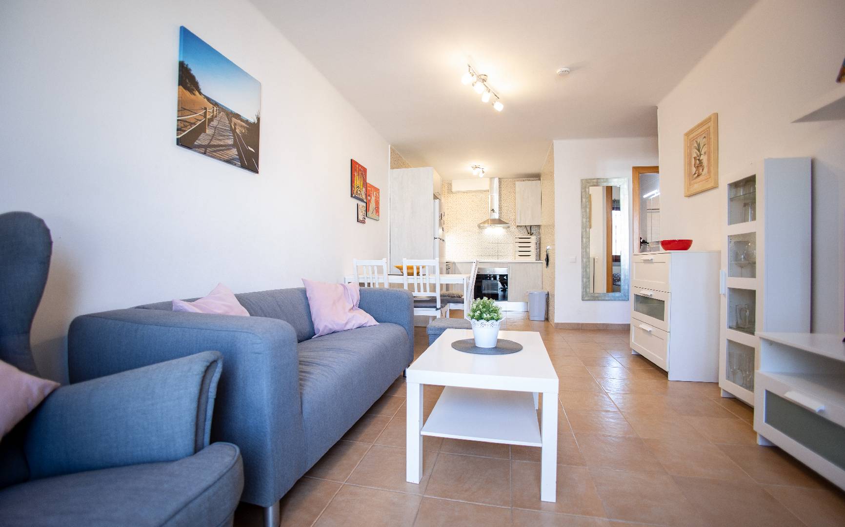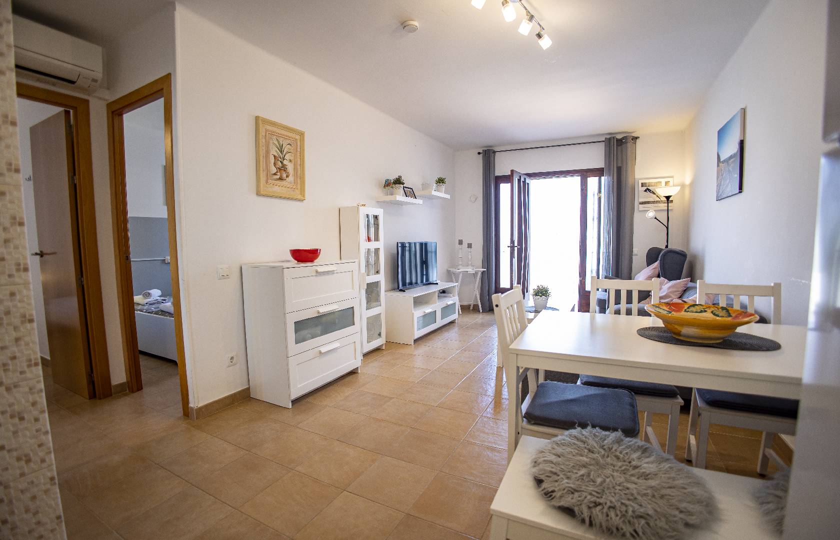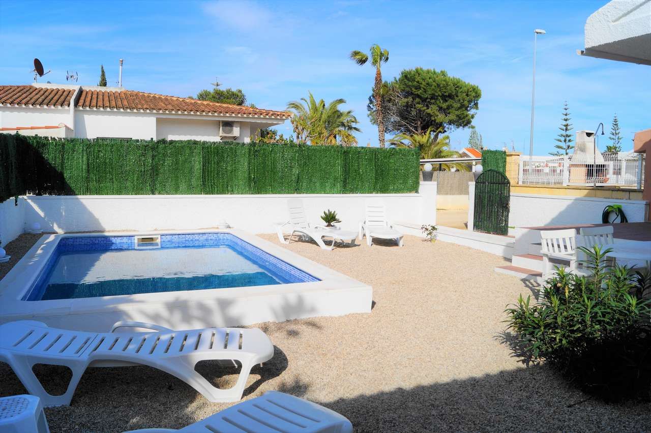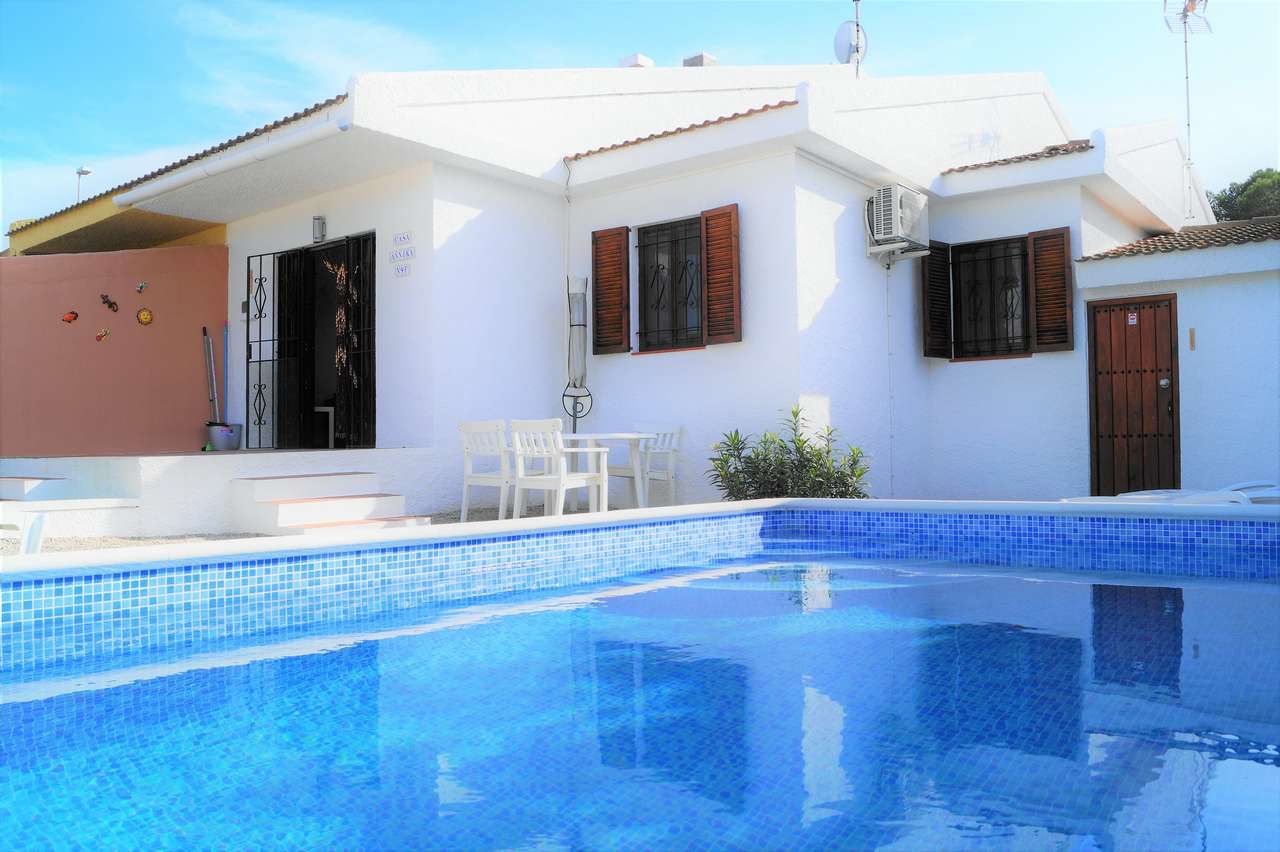 El chalet adosado Annika está equipado para 4 personas y se encuentra a unos 500 metros de la playa. La propiedad está completamente vallada, por lo que una mascota puede moverse libremente por el jardín. Al entrar en la casa que fue completamente renovada en el 2017, al entrar encontrará la sala de estar con sofá, televisión/Sat y aire acondicionado. A continuación, está la mesa de comedor con 2 sillas y un banco, la cocina abierta, está equipada con todos los utensilios de cocina necesarios, vajilla, vitrocerámica, horno eléctrico, lavavajillas, microondas, etc. El pasillo conduce al aseo con ducha, al dormitorio con una cama doble que consta de 2 colchones y al pequeño dormitorio con una cama individual que se puede convertir en una cama doble. Ambos dormitorios disponen de un armario ropero y tienen vistas hacía la piscina. A través del solárium con piscina privada y barbacoa encontraran un pequeño almacén donde pueden guardar las cosas de la playa o equipo deportivo.