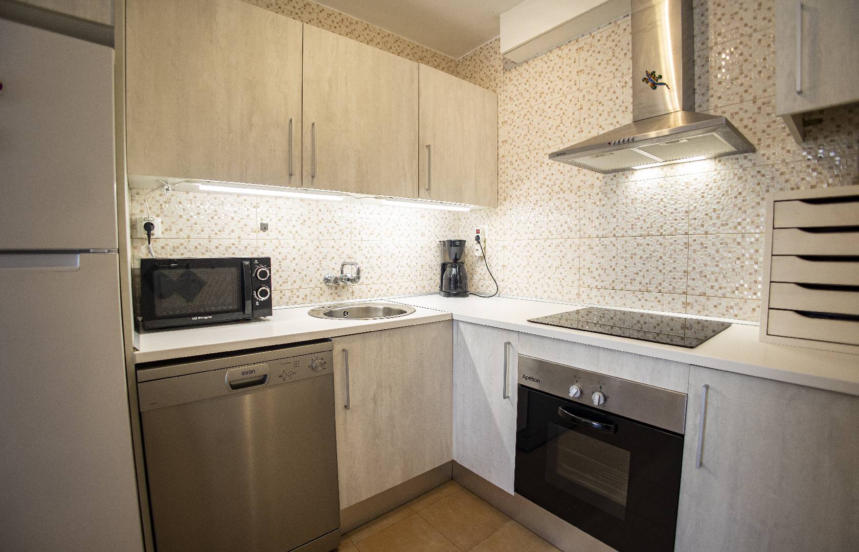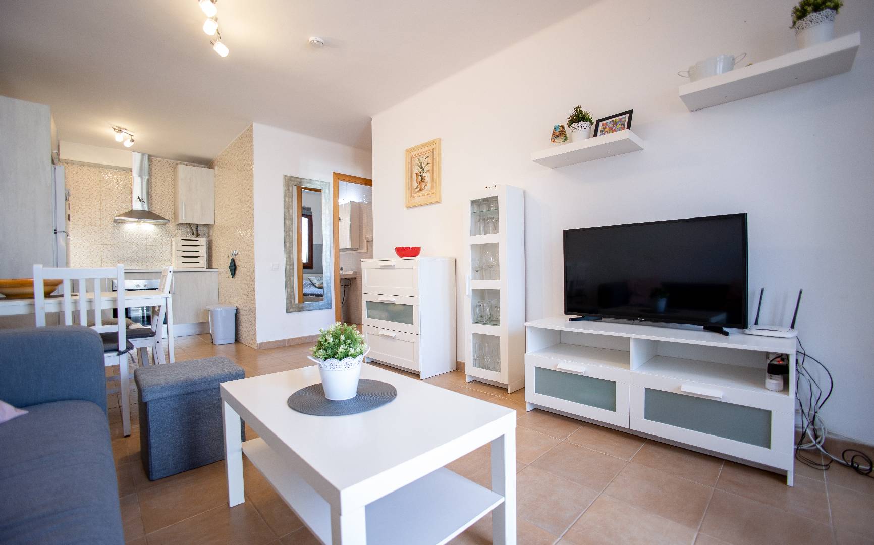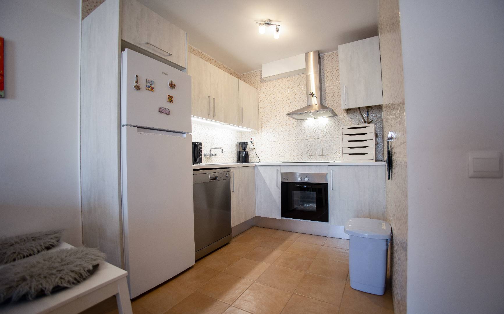El chalet adosado Annika está equipado para 4 personas y se encuentra a unos 500 metros de la playa. La propiedad está completamente vallada, por lo que una mascota puede moverse libremente por el jardín. Al entrar en la casa que fue completamente renovada en el 2017, al entrar encontrará la sala de estar con sofá, televisión/Sat y aire acondicionado. A continuación, está la mesa de comedor con 2 sillas y un banco, la cocina abierta, está equipada con todos los utensilios de cocina necesarios, vajilla, vitrocerámica, horno eléctrico, lavavajillas, microondas, etc. El pasillo conduce al aseo con ducha, al dormitorio con una cama doble que consta de 2 colchones y al pequeño dormitorio con una cama individual que se puede convertir en una cama doble. Ambos dormitorios disponen de un armario ropero y tienen vistas hacía la piscina. A través del solárium con piscina privada y barbacoa encontraran un pequeño almacén donde pueden guardar las cosas de la playa o equipo deportivo.