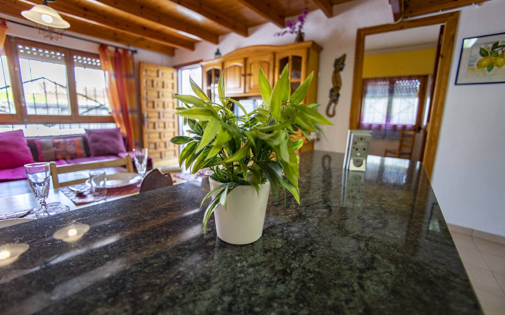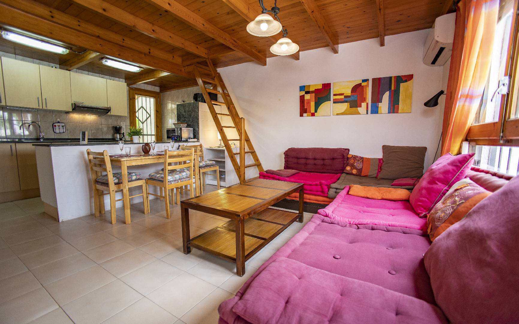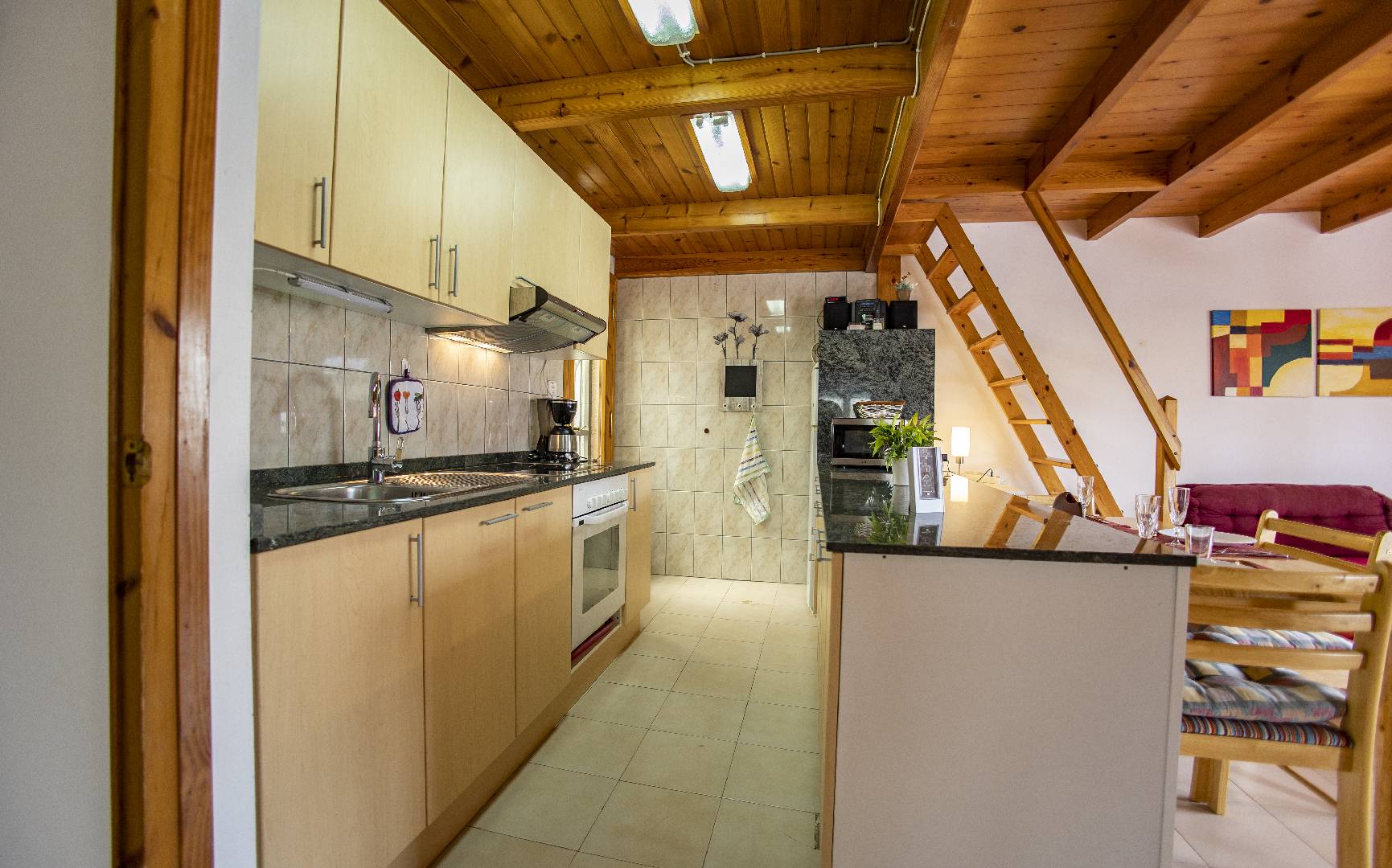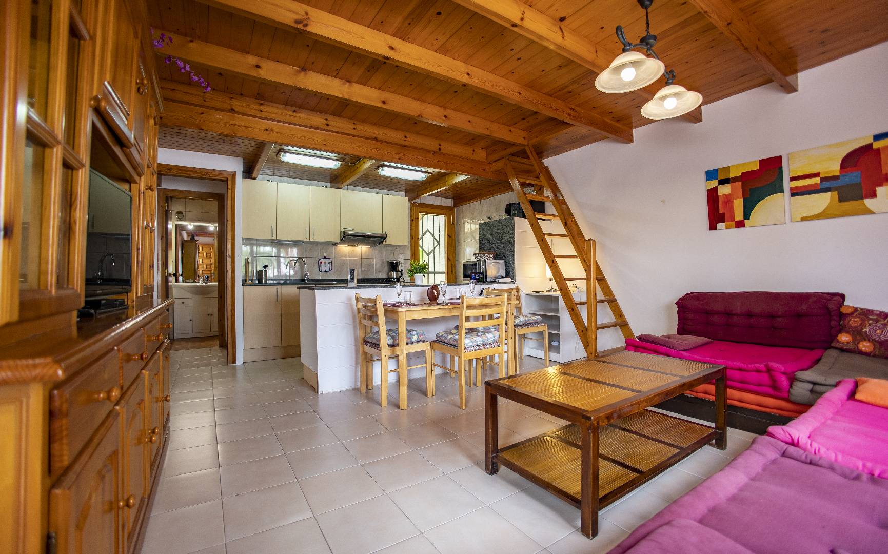 Entrando a la casa, directamente está el salón-comedor con cocina americana. En frente de la puerta hay una escalera que lleva a la buhardilla que está cerrada y únicamente para el uso exclusivo de los propietarios. Detrás de la cocina hay una puerta que da acceso al pequeño lavadero.