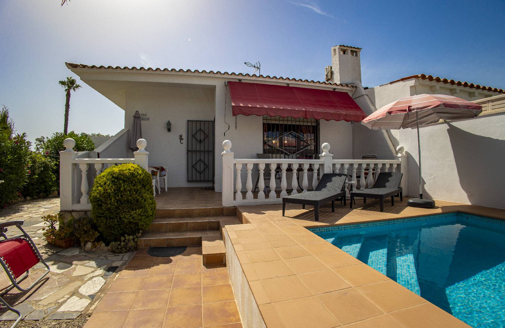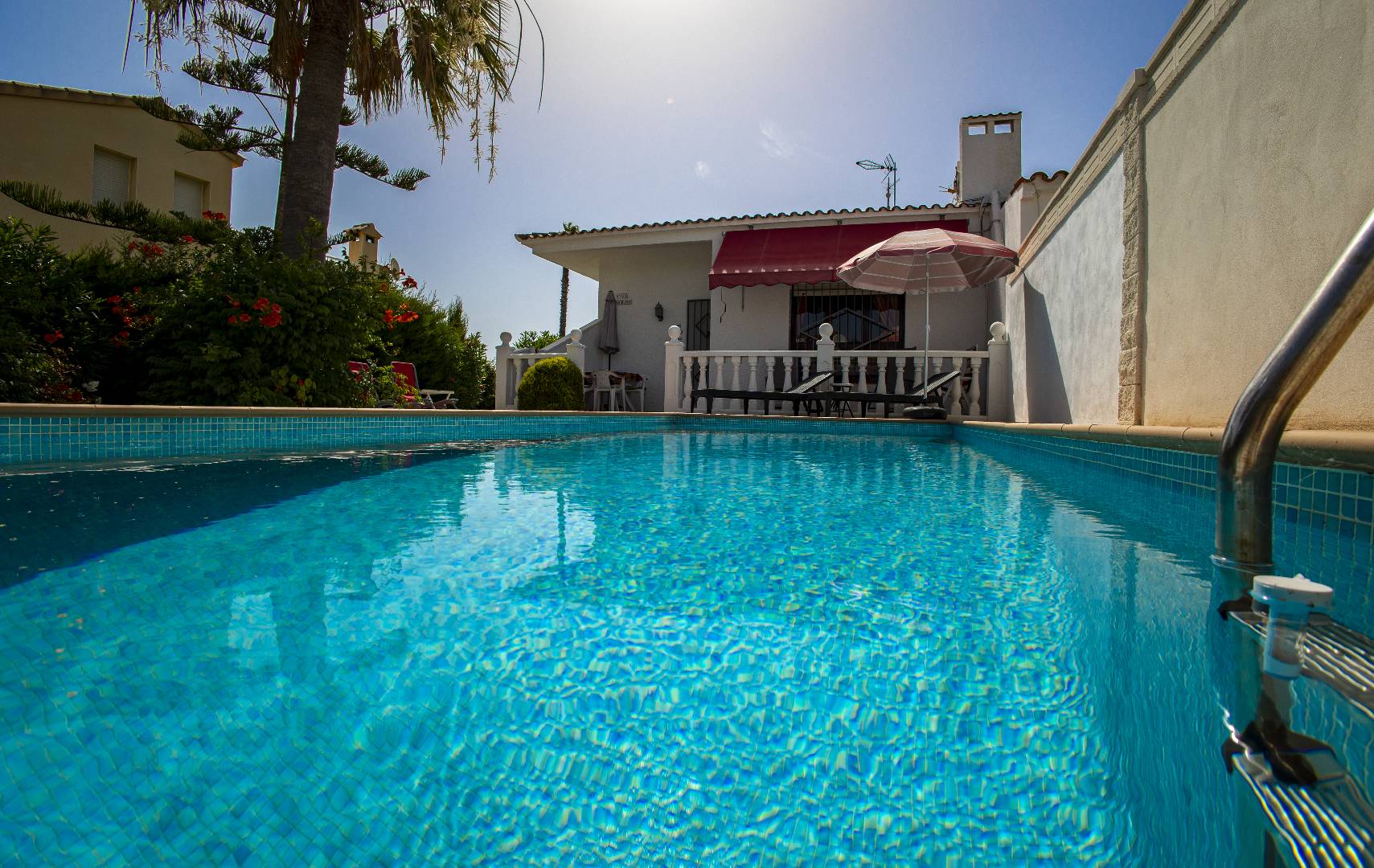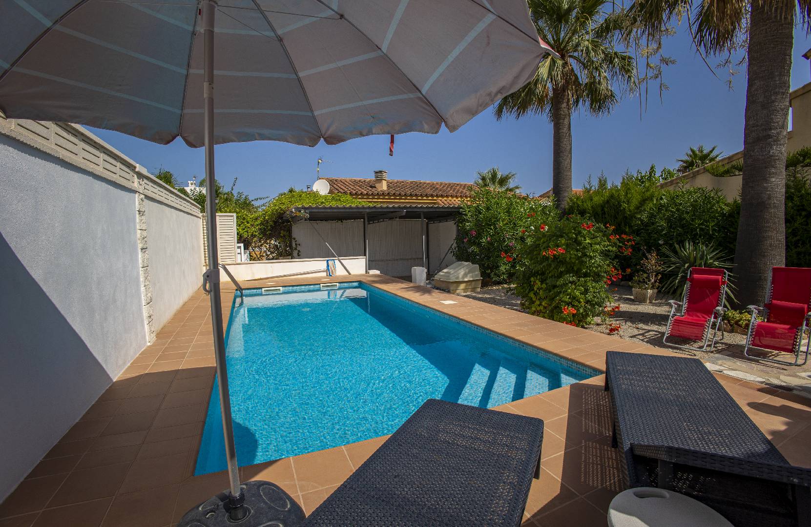 El chalet semiadosado Cochise, con capacidad para 4 personas se encuentra a unos 450 m del paseo marítimo y está completamente vallado. En zona interior donde se estacionar el choche está cubierta y ofrece una buena sombra para su vehículo. Entrando desde el aparcamiento, a la derecha se encuentra la piscina privada que dispone de una escalera de obra y una escalera metálica, cerca de la ducha exterior. Siguiendo el camino hormigonado entre la piscina y la zona ajardinada se llega a la terraza elevada donde se encuentra una pequeña mesa de terraza.