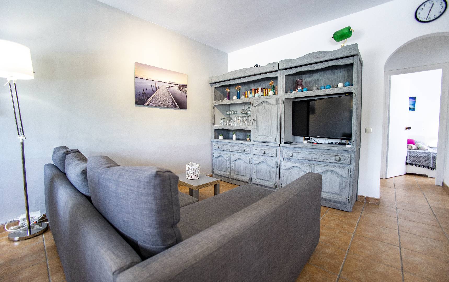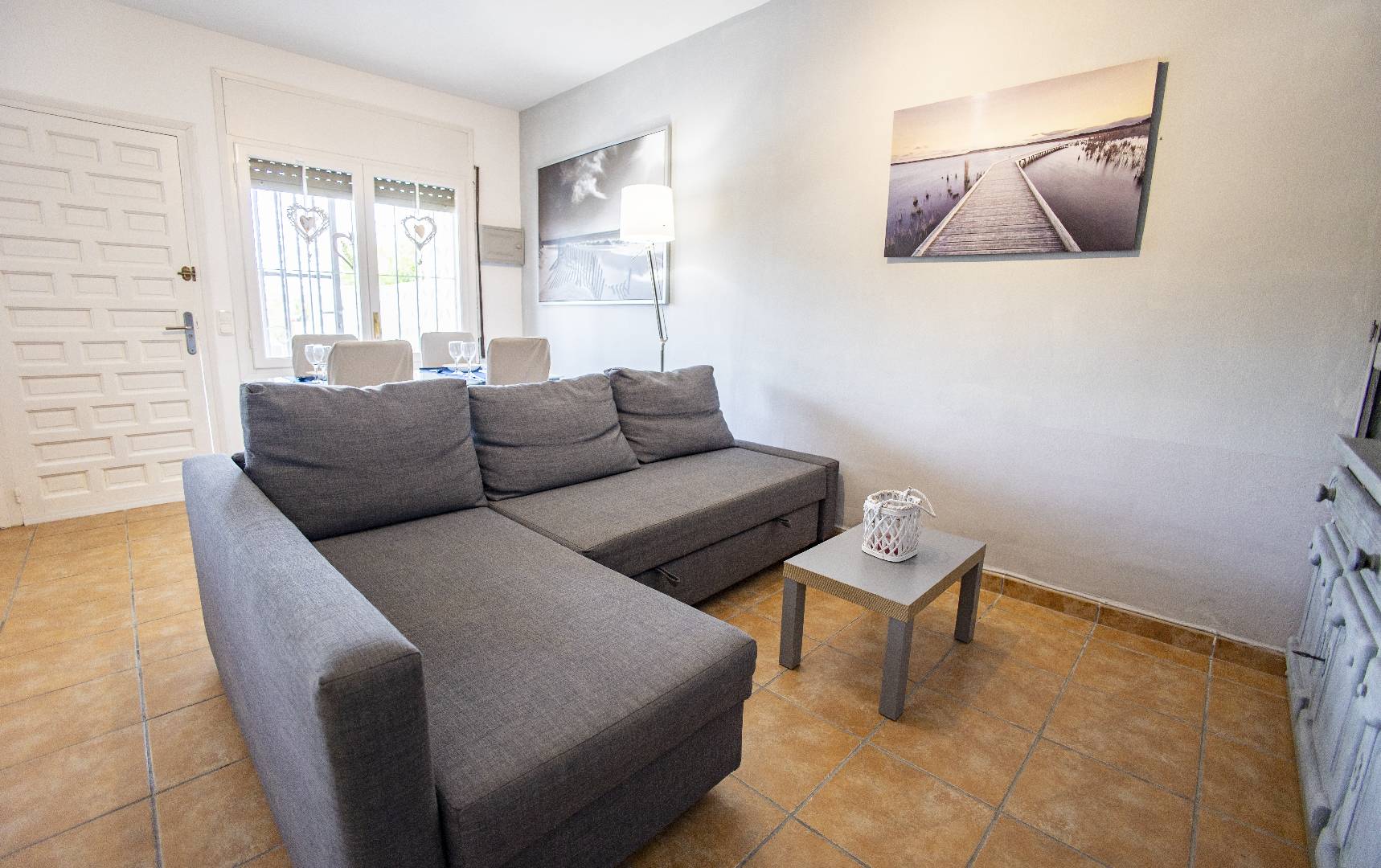 Una vez accede a la casa está la zona del salón-comedor, a la derecha la cocina con barra americana y a continuación un pequeño lavadero. Al fondo tras una puerta se llega al pasillo donde podrá acceder a mano derecha hay un aseo con ducha, en frente el dormitorio con cama de matrimonio y armario empotrado y al lado hay otro dormitorio con dos camas individuales y armario empotrado. En exterior de la casa al lado de la terraza hay una zona con una barbacoa portátil.