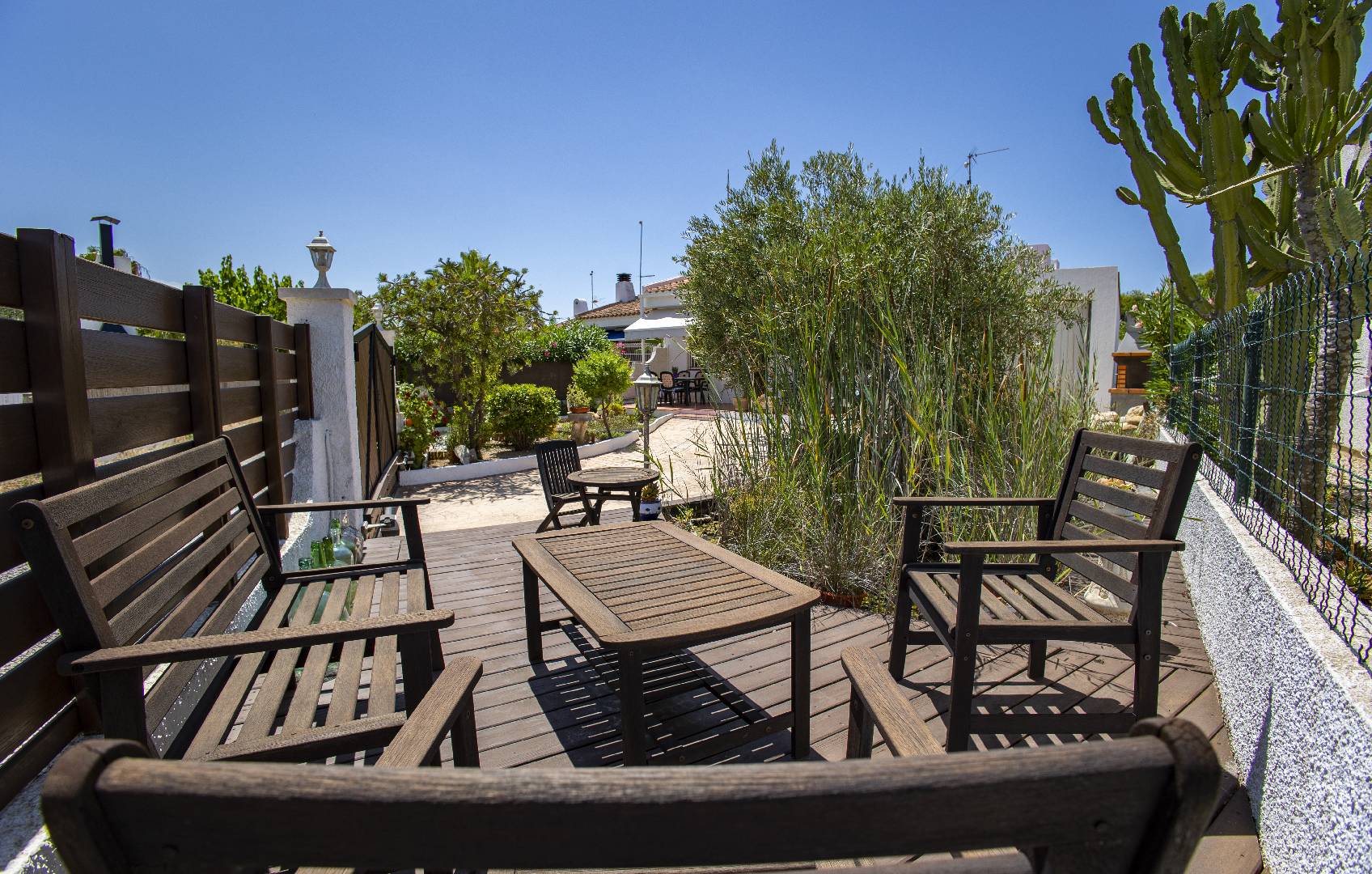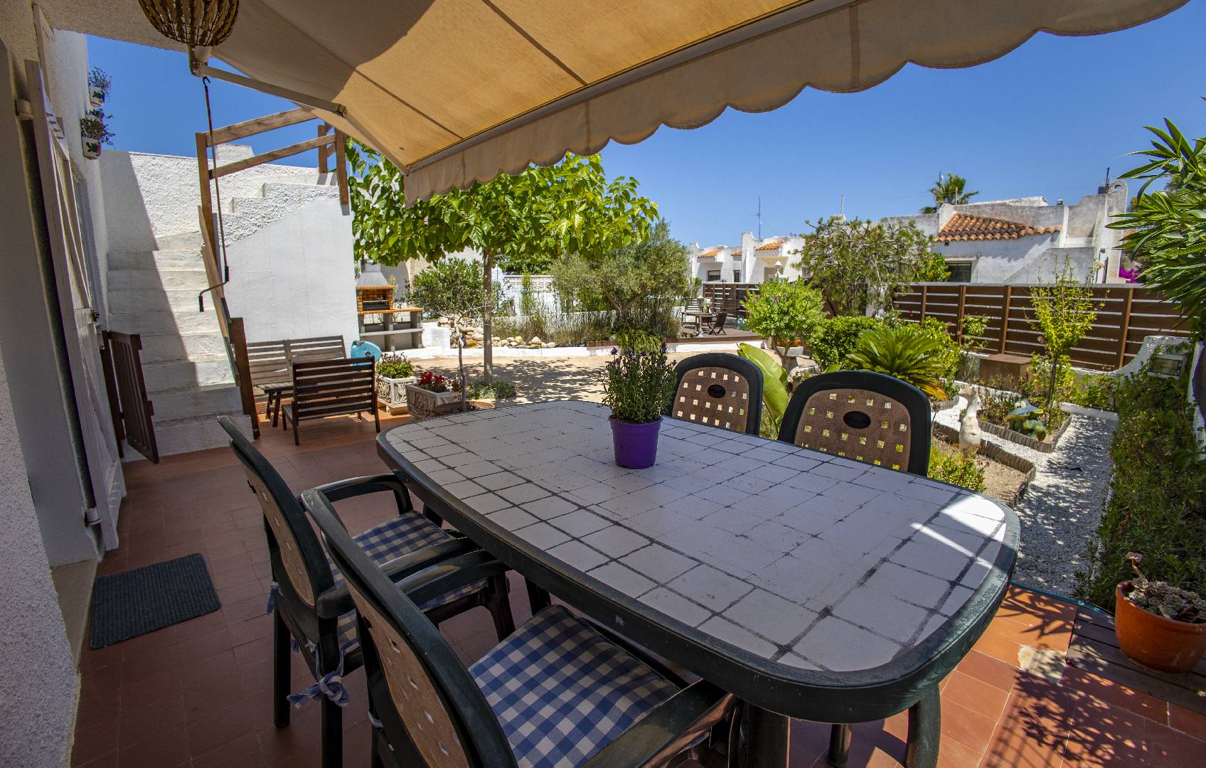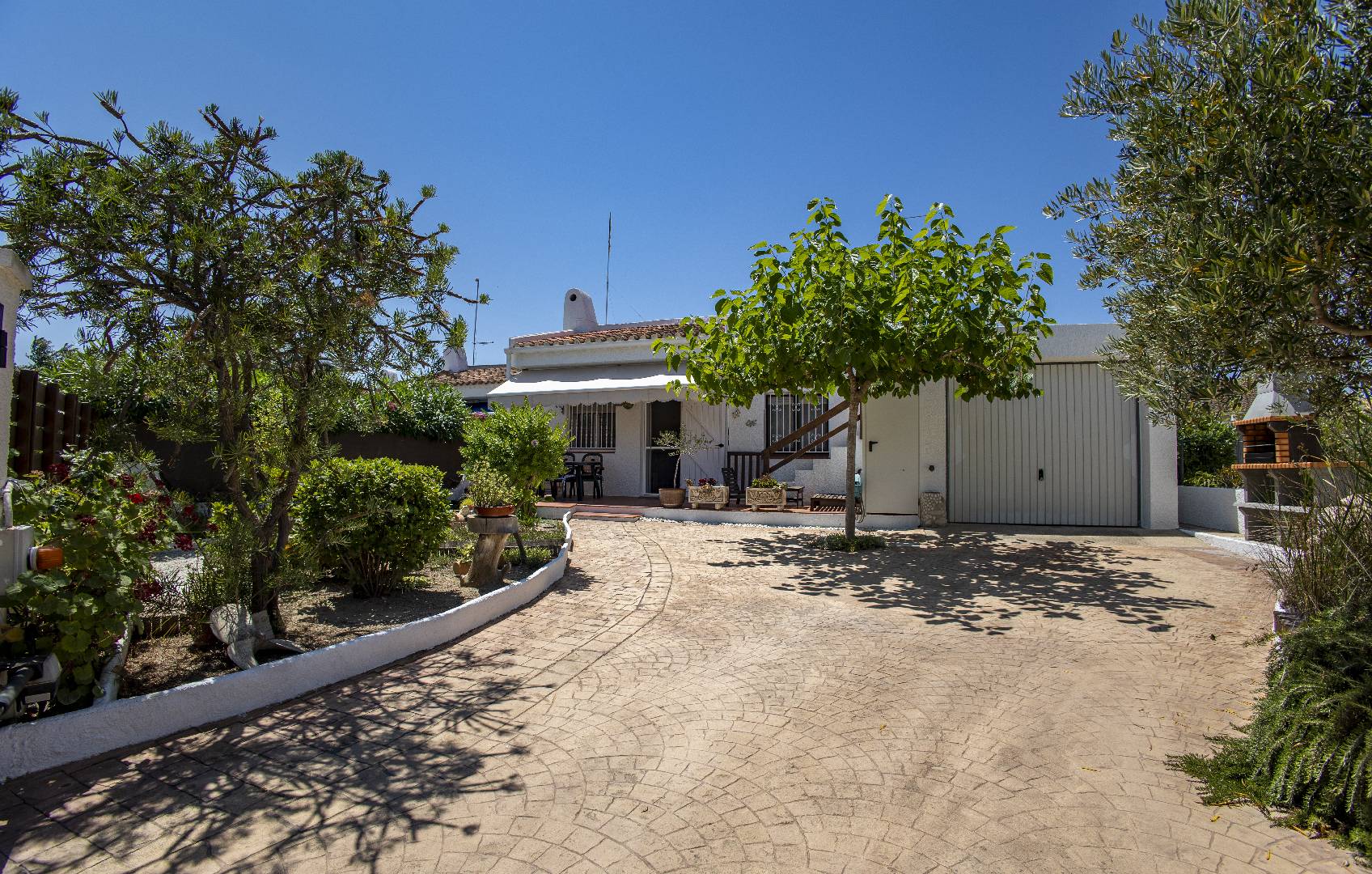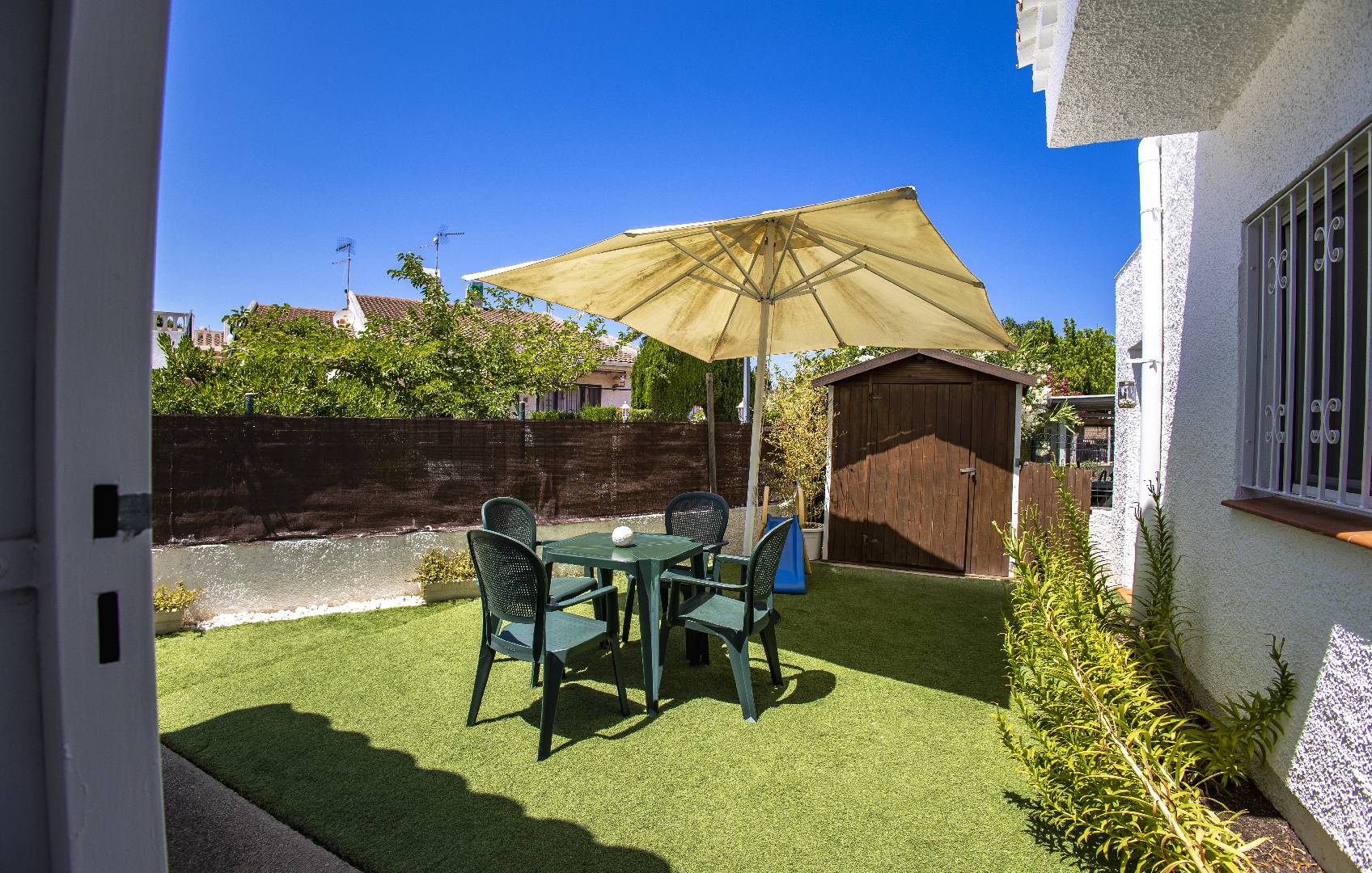 El chalet Maricel, es un alojamiento semiadosado con capacidad para 4 personas, se encuentra a unos 40m del paseo marítimo, muy cerca del supermercado y de la farmacia. El Chalet Maricel está completamente vallado, en beneficio de su mascota. La entrada peatonal cimentada es amplia, para que puedan aparcar un vehículo en la parcela, debajo de la sombra de un árbol. El alojamiento dispone de un amplio almacén por si desean guardar las cosas de la playa, material de pesca o el material de deporte acuático. En uno de los dos laterales hay una pequeña zona ajardinada y en el otro lateral dispone una pequeña terraza elevada de madera con la compañía de una pequeña fuente decorativa y un joven Olivo. La terraza frontal semicubierta dispone de una marquesina que ofrece sombra en los días más soleados, la terraza está equipada con mobiliario diverso, una mesa con 4 sillas para poder disfrutar de las comidas, unos bancos de madera para poder gozar de la lectura o del sol. La barbacoa de obra está situada a pocos metros de la terraza. Entrando a la casa se encontrará directamente en el amplio salón-comedor que ofrece sitio para 6 personas con sofá, 1 sillón, mesa, sillas, mueble de tv/sat y vitrina. Desde el salón se accede al pequeño pasillo que lleva a mano derecha a la habitación de matrimonio con su gran armario ropero, al fondo a la habitación con 2 camas individuales y un pequeño armario empotrado y a la izquierda al aseo con ducha. A continuación del comedor se encuentra una gran cocina independiente con una mesa y 4 sillas, la cocina está equipada con encimera de gas, horno eléctrico, lavavajillas, microondas, cafetera Dolce Gusto y otra italiana. La cocina dispone de una amplia despensa con lavadora. Desde la de la cocina hay una puerta que da acceso al jardín trasero que también dispone de muebles de tarraza y césped artificial. Es una zona con más intimidad.