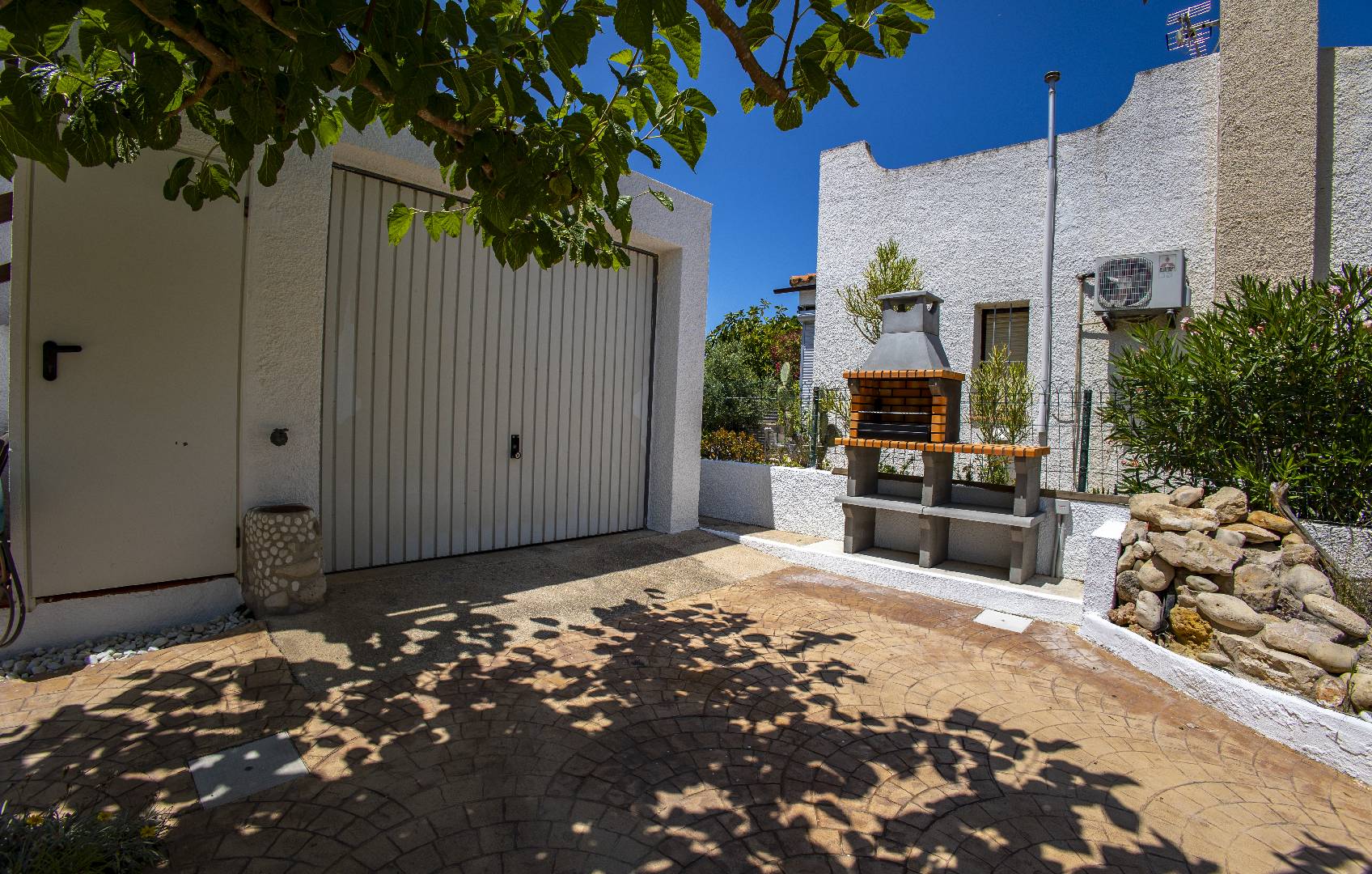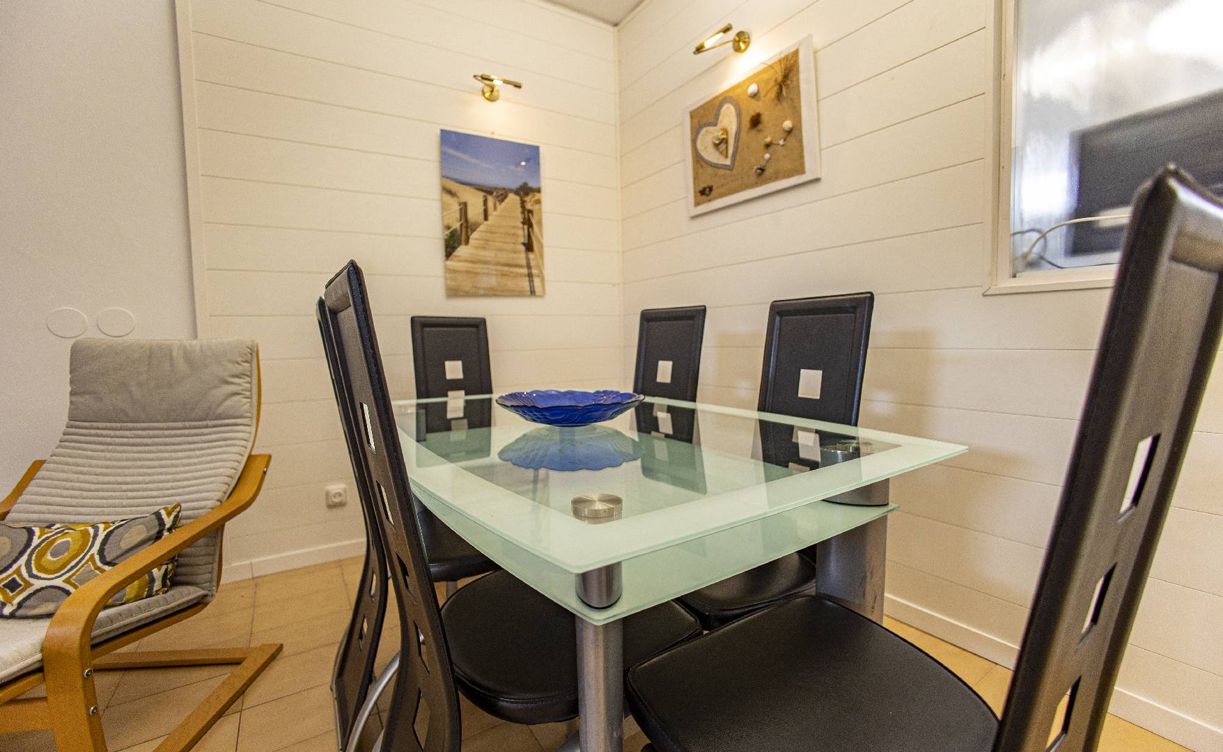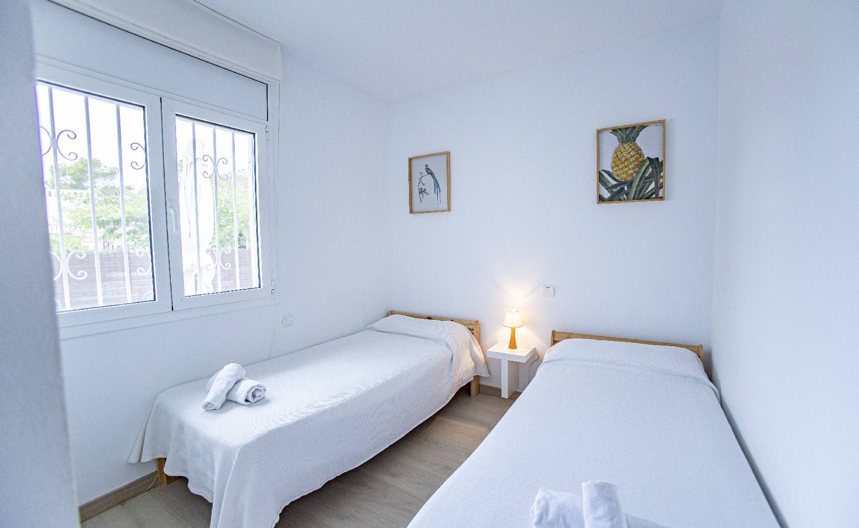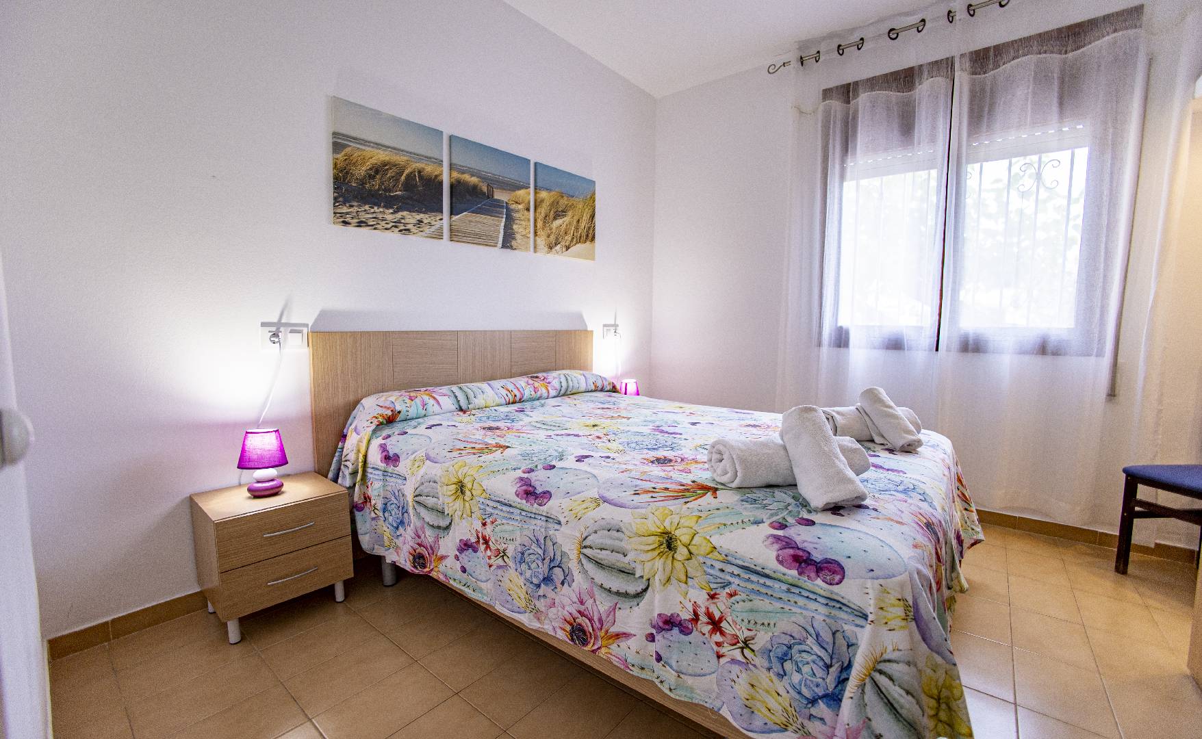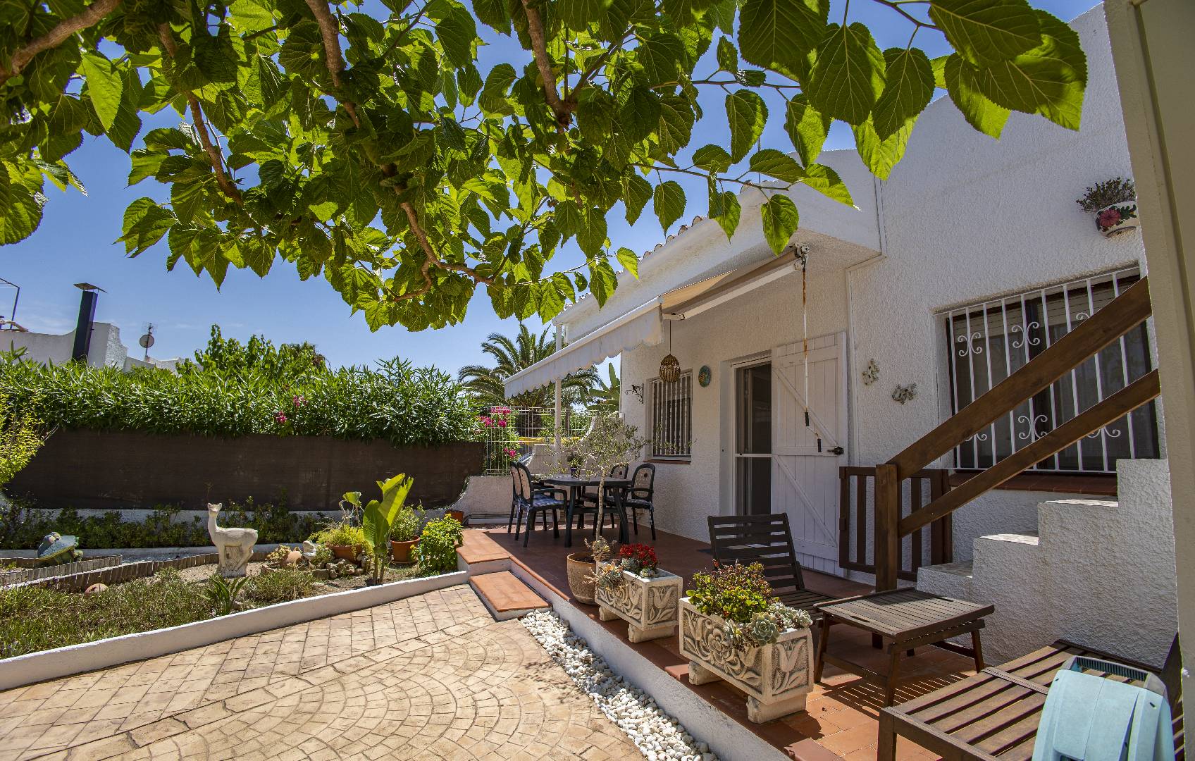 El chalet Maricel, es un alojamiento semiadosado con capacidad para 4 personas, se encuentra a unos 40m del paseo marítimo, muy cerca del supermercado y de la farmacia. El Chalet Maricel está completamente vallado, en beneficio de su mascota. La entrada peatonal cimentada es amplia, para que puedan aparcar un vehículo en la parcela, debajo de la sombra de un árbol. El alojamiento dispone de un amplio almacén por si desean guardar las cosas de la playa, material de pesca o el material de deporte acuático. En uno de los dos laterales hay una pequeña zona ajardinada y en el otro lateral dispone una pequeña terraza elevada de madera con la compañía de una pequeña fuente decorativa y un joven Olivo. La terraza frontal semicubierta dispone de una marquesina que ofrece sombra en los días más soleados, la terraza está equipada con mobiliario diverso, una mesa con 4 sillas para poder disfrutar de las comidas, unos bancos de madera para poder gozar de la lectura o del sol. La barbacoa de obra está situada a pocos metros de la terraza. Entrando a la casa se encontrará directamente en el amplio salón-comedor que ofrece sitio para 6 personas con sofá, 1 sillón, mesa, sillas, mueble de tv/sat y vitrina. Desde el salón se accede al pequeño pasillo que lleva a mano derecha a la habitación de matrimonio con su gran armario ropero, al fondo a la habitación con 2 camas individuales y un pequeño armario empotrado y a la izquierda al aseo con ducha. A continuación del comedor se encuentra una gran cocina independiente con una mesa y 4 sillas, la cocina está equipada con encimera de gas, horno eléctrico, lavavajillas, microondas, cafetera Dolce Gusto y otra italiana. La cocina dispone de una amplia despensa con lavadora. Desde la de la cocina hay una puerta que da acceso al jardín trasero que también dispone de muebles de tarraza y césped artificial. Es una zona con más intimidad.