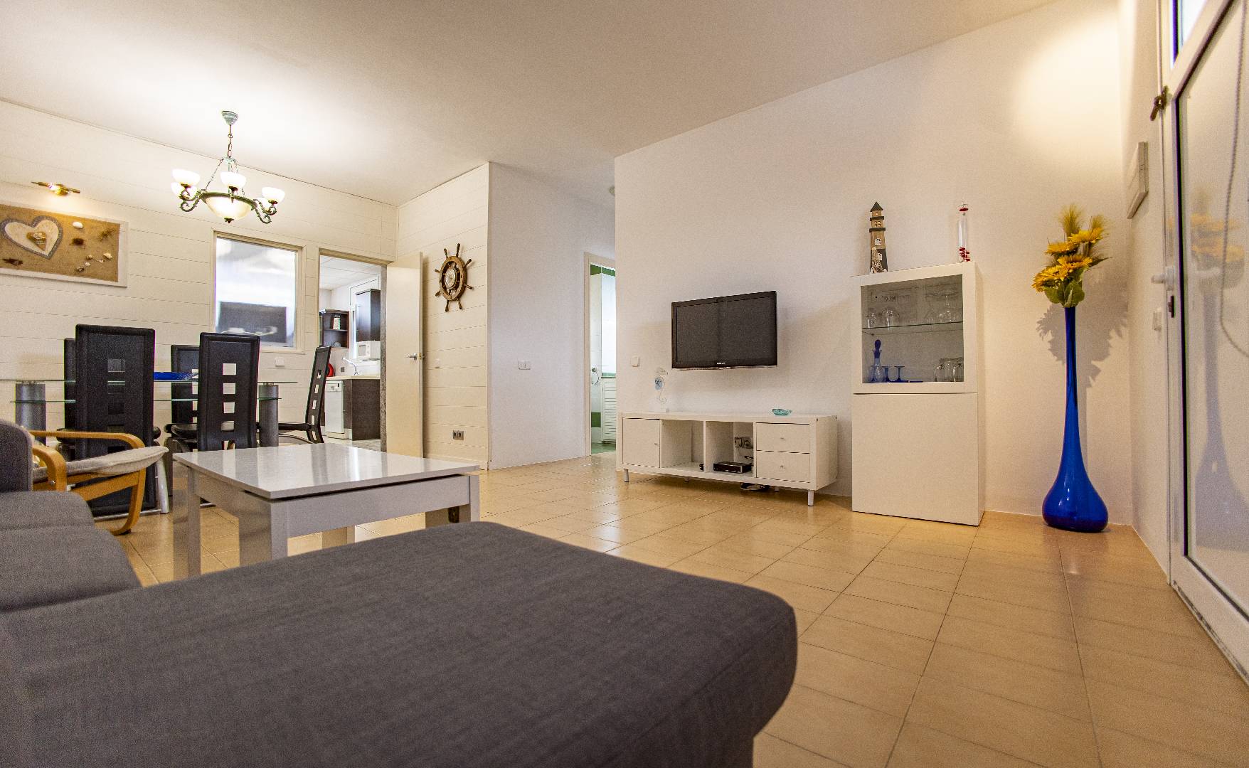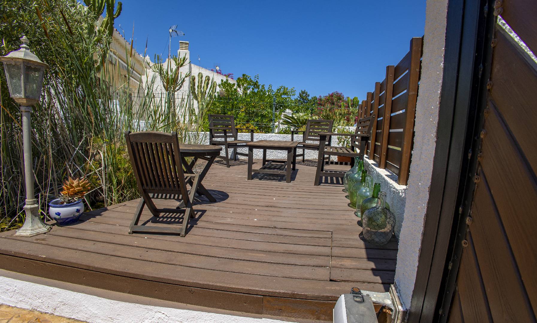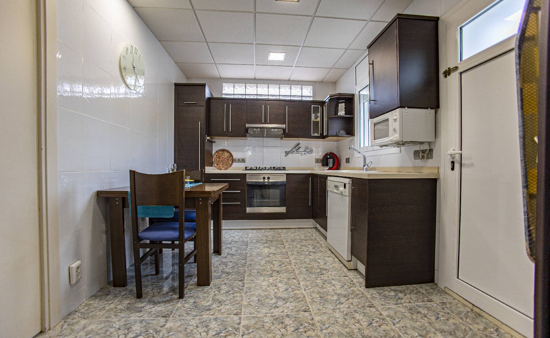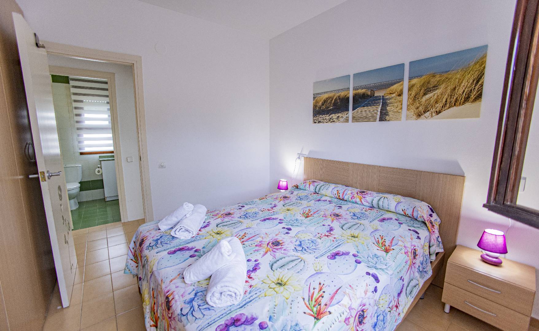 El chalet Maricel, es un alojamiento semiadosado con capacidad para 4 personas, se encuentra a unos 40m del paseo marítimo, muy cerca del supermercado y de la farmacia. El Chalet Maricel está completamente vallado, en beneficio de su mascota. La entrada peatonal cimentada es amplia, para que puedan aparcar un vehículo en la parcela, debajo de la sombra de un árbol. El alojamiento dispone de un amplio almacén por si desean guardar las cosas de la playa, material de pesca o el material de deporte acuático. En uno de los dos laterales hay una pequeña zona ajardinada y en el otro lateral dispone una pequeña terraza elevada de madera con la compañía de una pequeña fuente decorativa y un joven Olivo. La terraza frontal semicubierta dispone de una marquesina que ofrece sombra en los días más soleados, la terraza está equipada con mobiliario diverso, una mesa con 4 sillas para poder disfrutar de las comidas, unos bancos de madera para poder gozar de la lectura o del sol. La barbacoa de obra está situada a pocos metros de la terraza. Entrando a la casa se encontrará directamente en el amplio salón-comedor que ofrece sitio para 6 personas con sofá, 1 sillón, mesa, sillas, mueble de tv/sat y vitrina. Desde el salón se accede al pequeño pasillo que lleva a mano derecha a la habitación de matrimonio con su gran armario ropero, al fondo a la habitación con 2 camas individuales y un pequeño armario empotrado y a la izquierda al aseo con ducha. A continuación del comedor se encuentra una gran cocina independiente con una mesa y 4 sillas, la cocina está equipada con encimera de gas, horno eléctrico, lavavajillas, microondas, cafetera Dolce Gusto y otra italiana. La cocina dispone de una amplia despensa con lavadora. Desde la de la cocina hay una puerta que da acceso al jardín trasero que también dispone de muebles de tarraza y césped artificial. Es una zona con más intimidad.