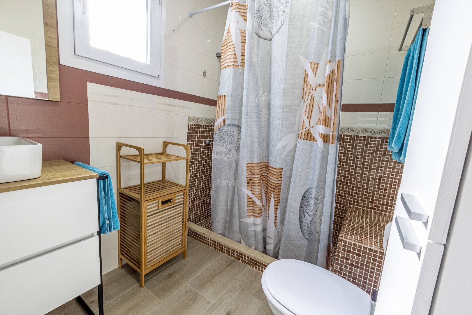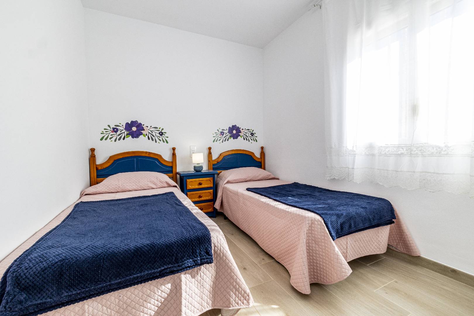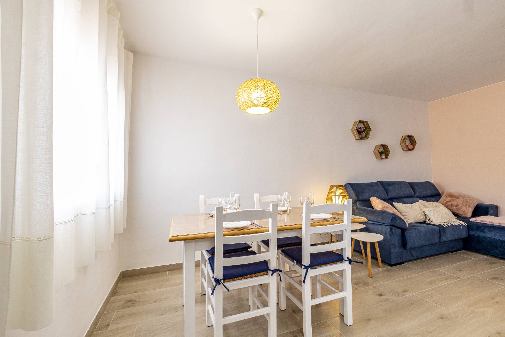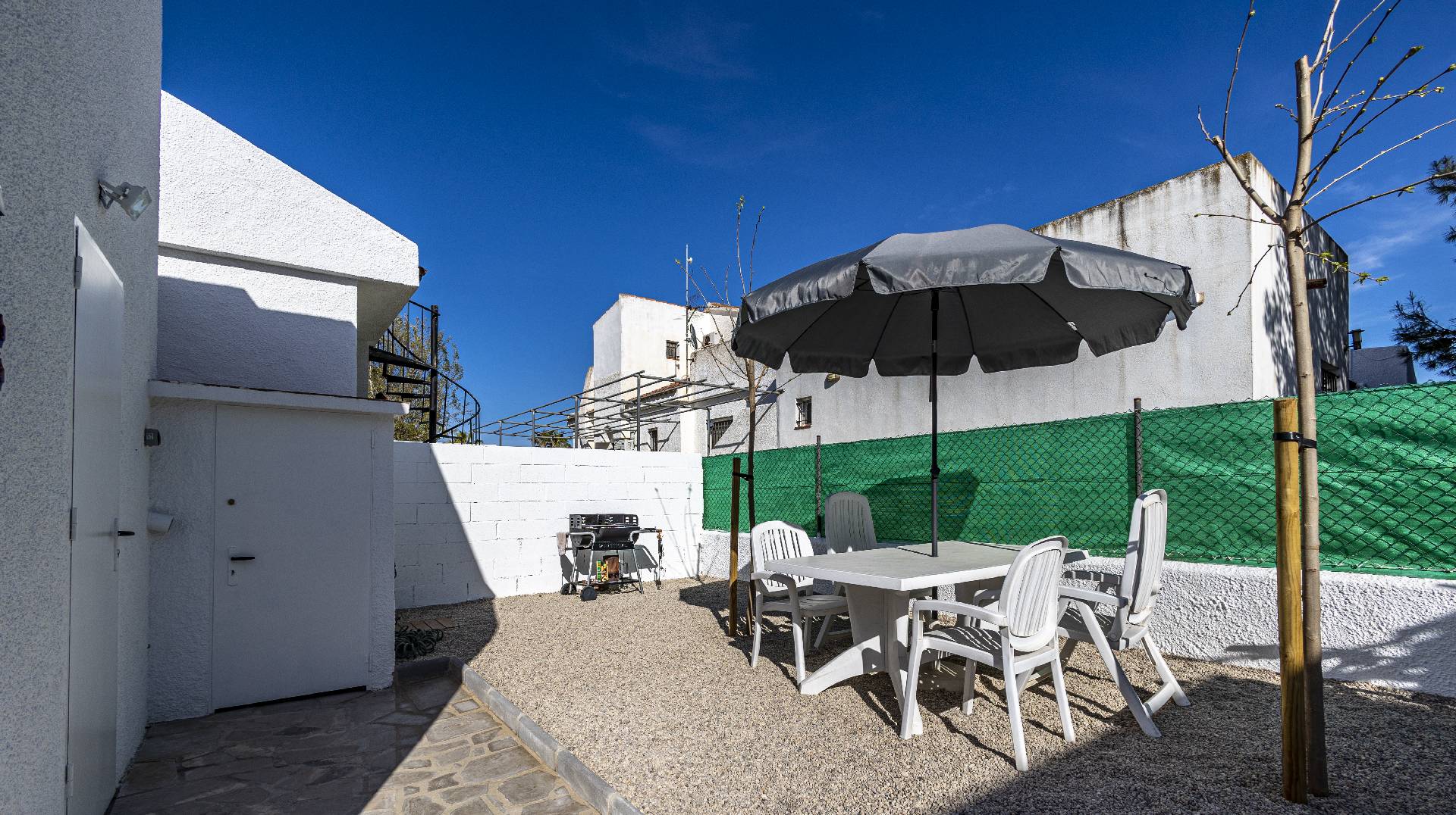Entrando a la casa encontrara directamente la zona del comedor a la izquierda, a la derecha la cocina con barra americana y una pequeña despensa con la lavadora. Al fondo el salón amplio ideal para descansar después de un día en la playa. Siguiendo el pequeño pasillo se encuentra a mano derecha el aseo con una ducha amplia, al fondo está la habitación pequeña con 2 camas individuales y armario empotrado, a la izquierda el dormitorio con cama de matrimonio y armarios empotradas. Detrás de la casa se encuentra una pequeña zona con muebles de terraza y una barbacoa.