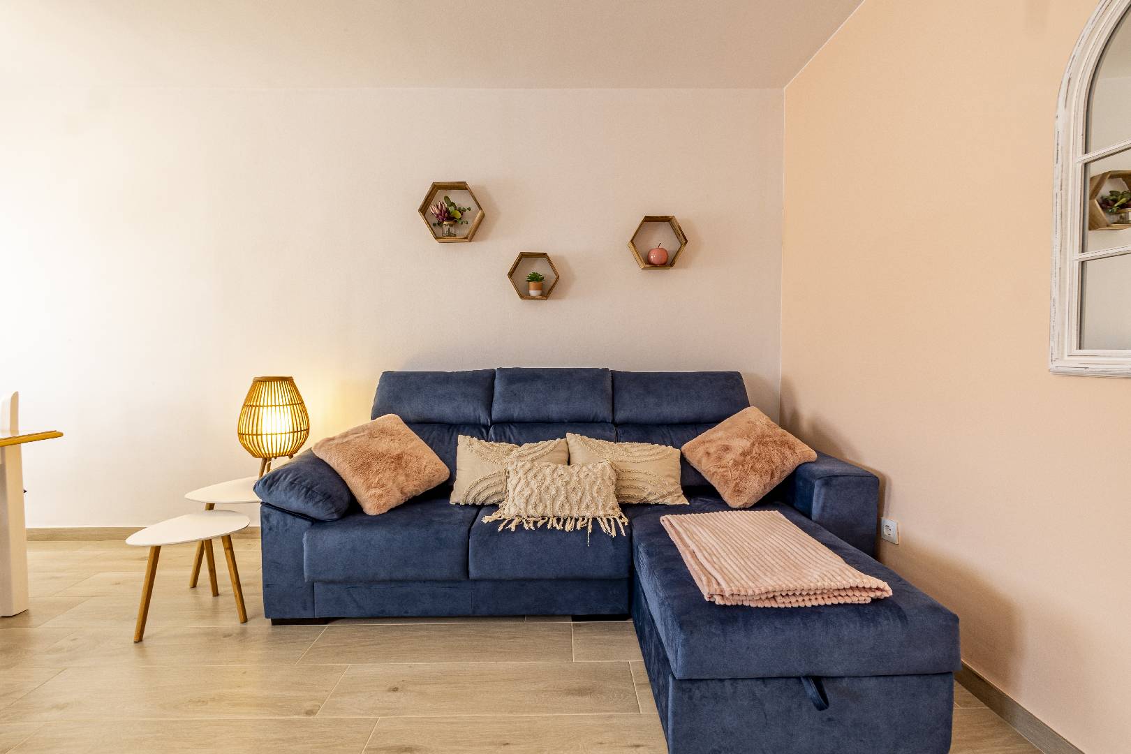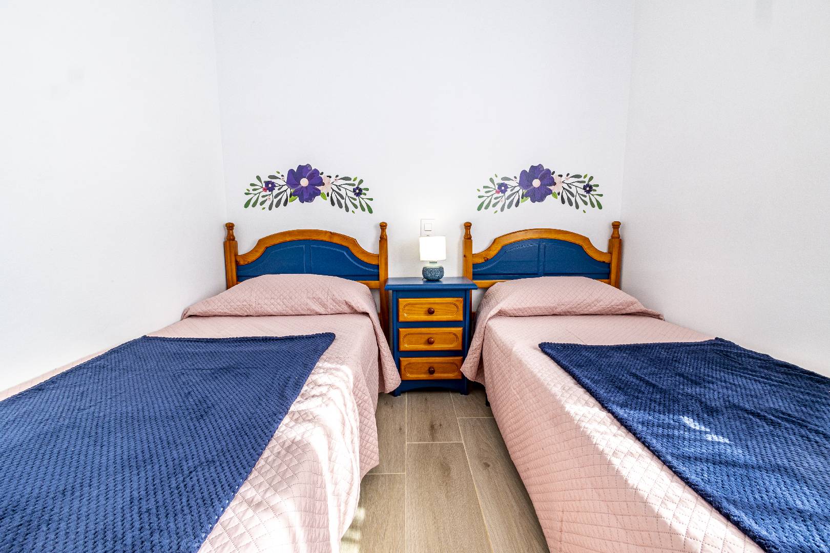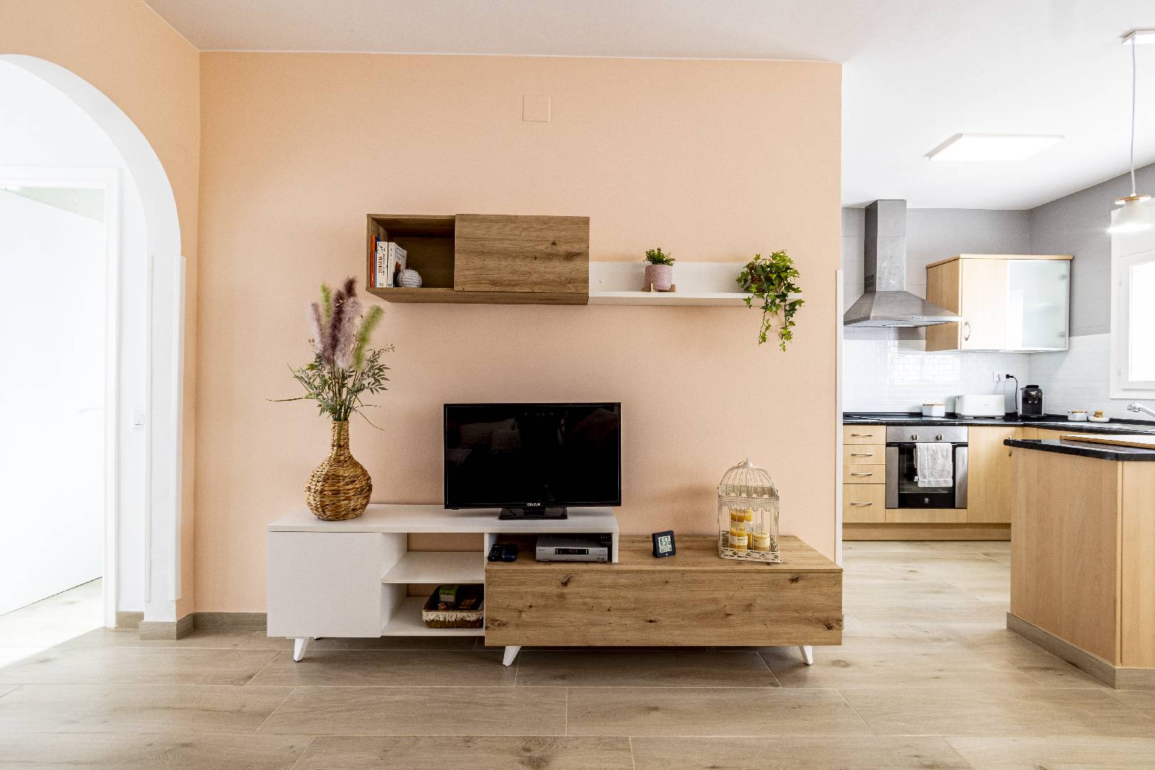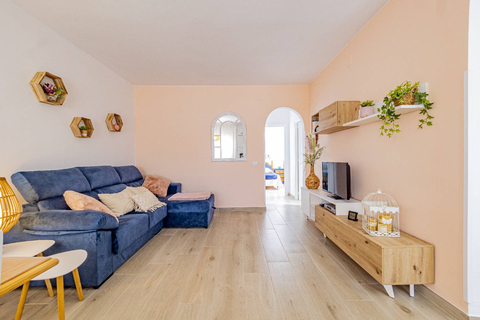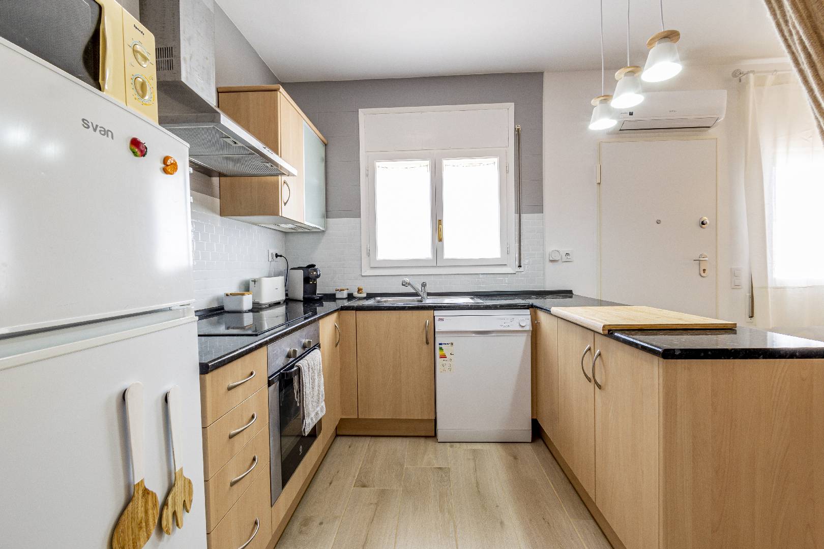 Entrando a la casa encontrara directamente la zona del comedor a la izquierda, a la derecha la cocina con barra americana y una pequeña despensa con la lavadora. Al fondo el salón amplio ideal para descansar después de un día en la playa. Siguiendo el pequeño pasillo se encuentra a mano derecha el aseo con una ducha amplia, al fondo está la habitación pequeña con 2 camas individuales y armario empotrado, a la izquierda el dormitorio con cama de matrimonio y armarios empotradas. Detrás de la casa se encuentra una pequeña zona con muebles de terraza y una barbacoa.