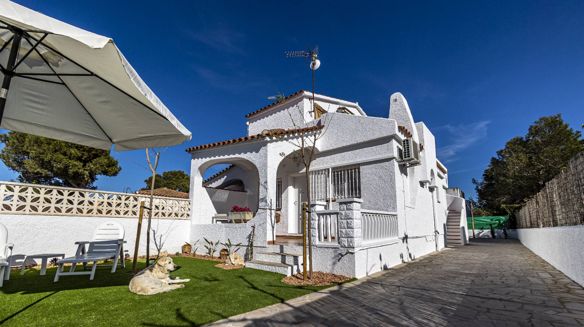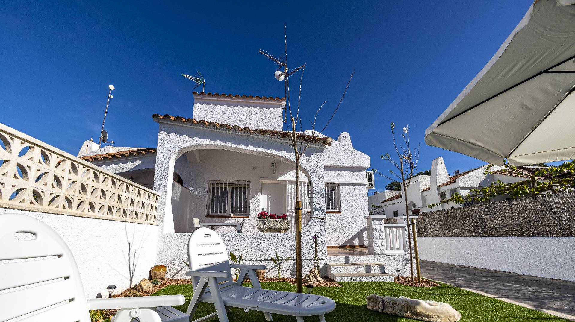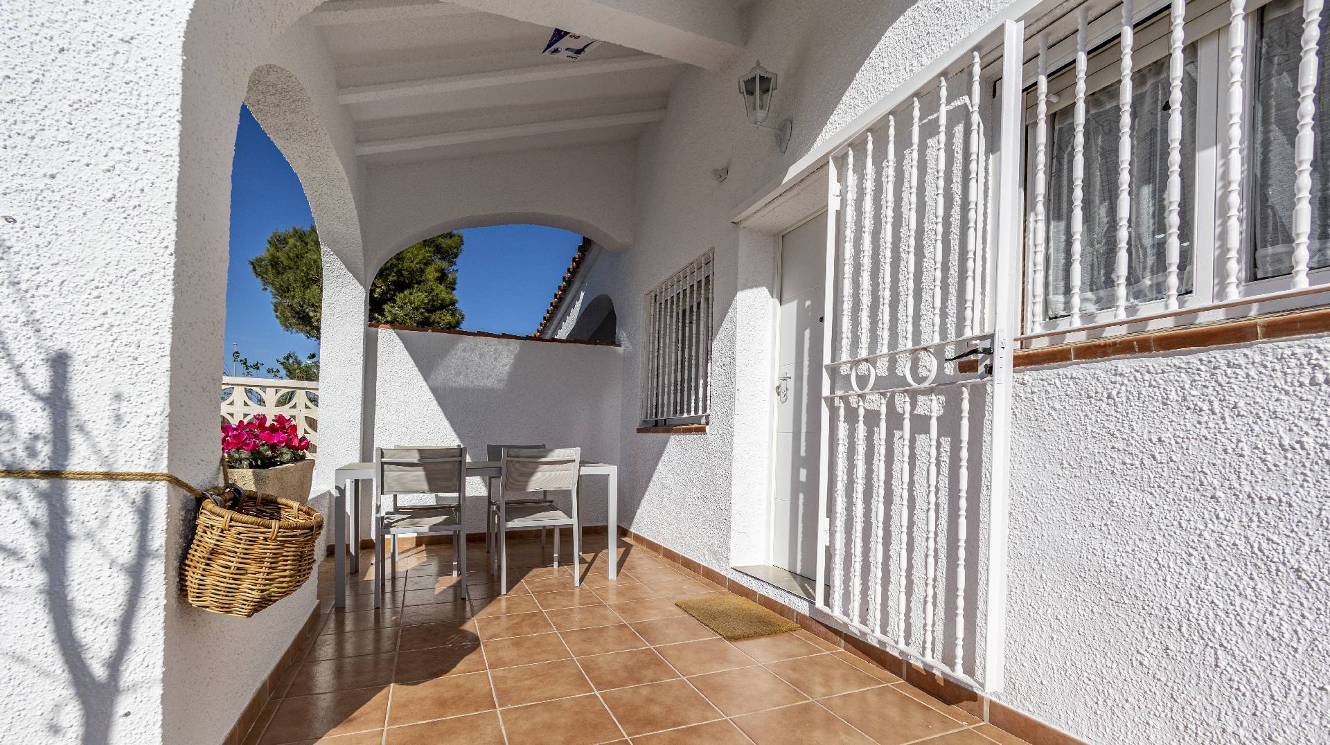 El chalet Marinera es un alojamiento semiadosado con capacidad para 4 personas, se encuentra a unos 60 m. del paseo marítimo, está completamente vallado y ofrece mucha intimidad. La entrada principal dispone de una zona adecuada para estacionar dos coches. A la izquierda antes de llegar a la terraza cubierta hay una zona con césped artificial, ideal para tomar el sol y jugar con los niños, a la sombra de dos árboles. A través de la terraza cubierta con una mesa y 4 sillas se accede a la vivienda.