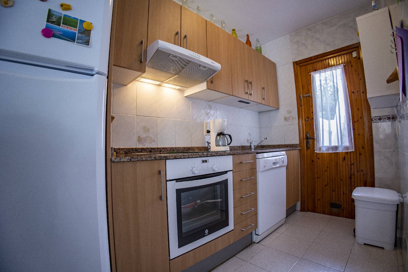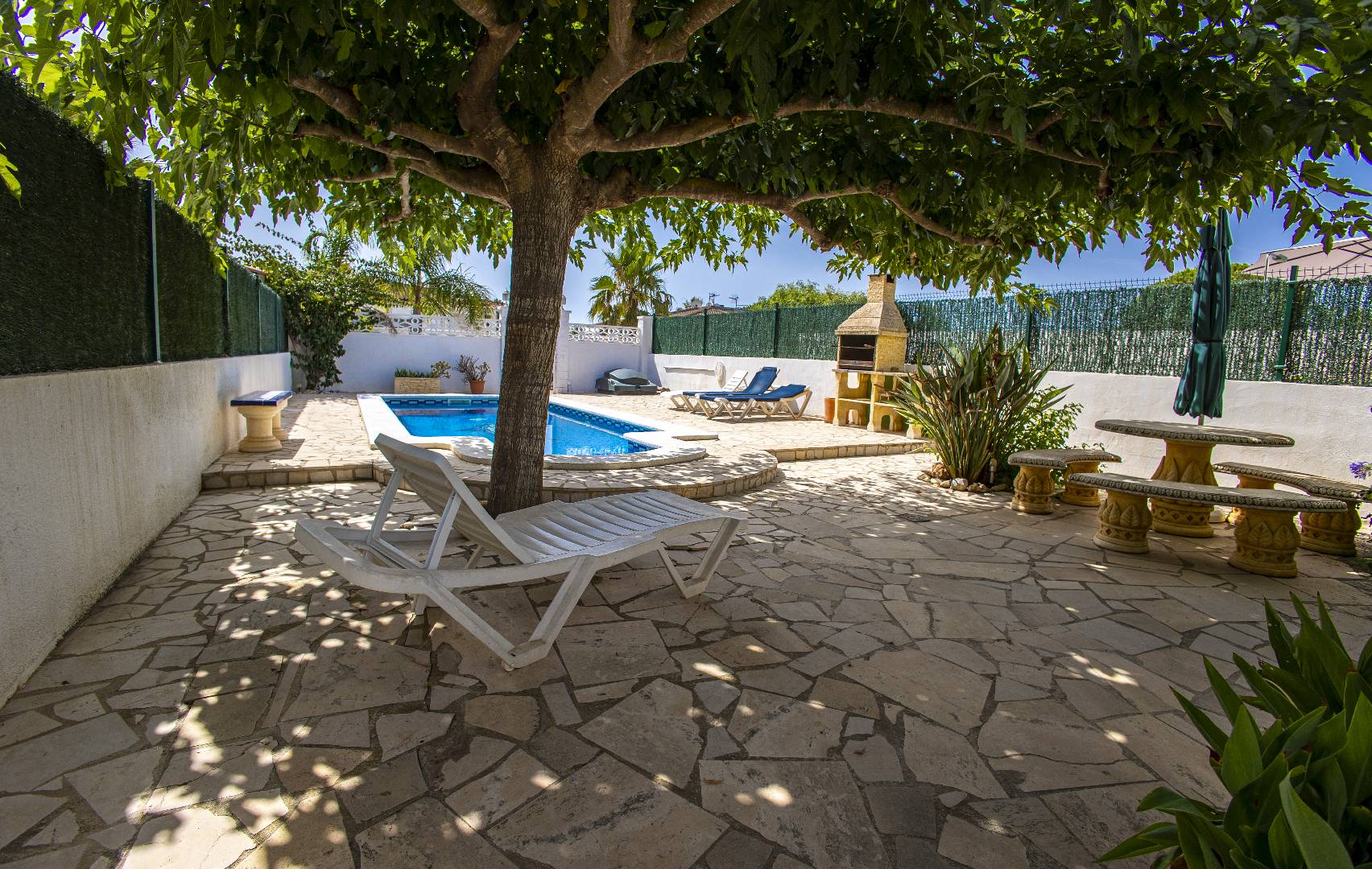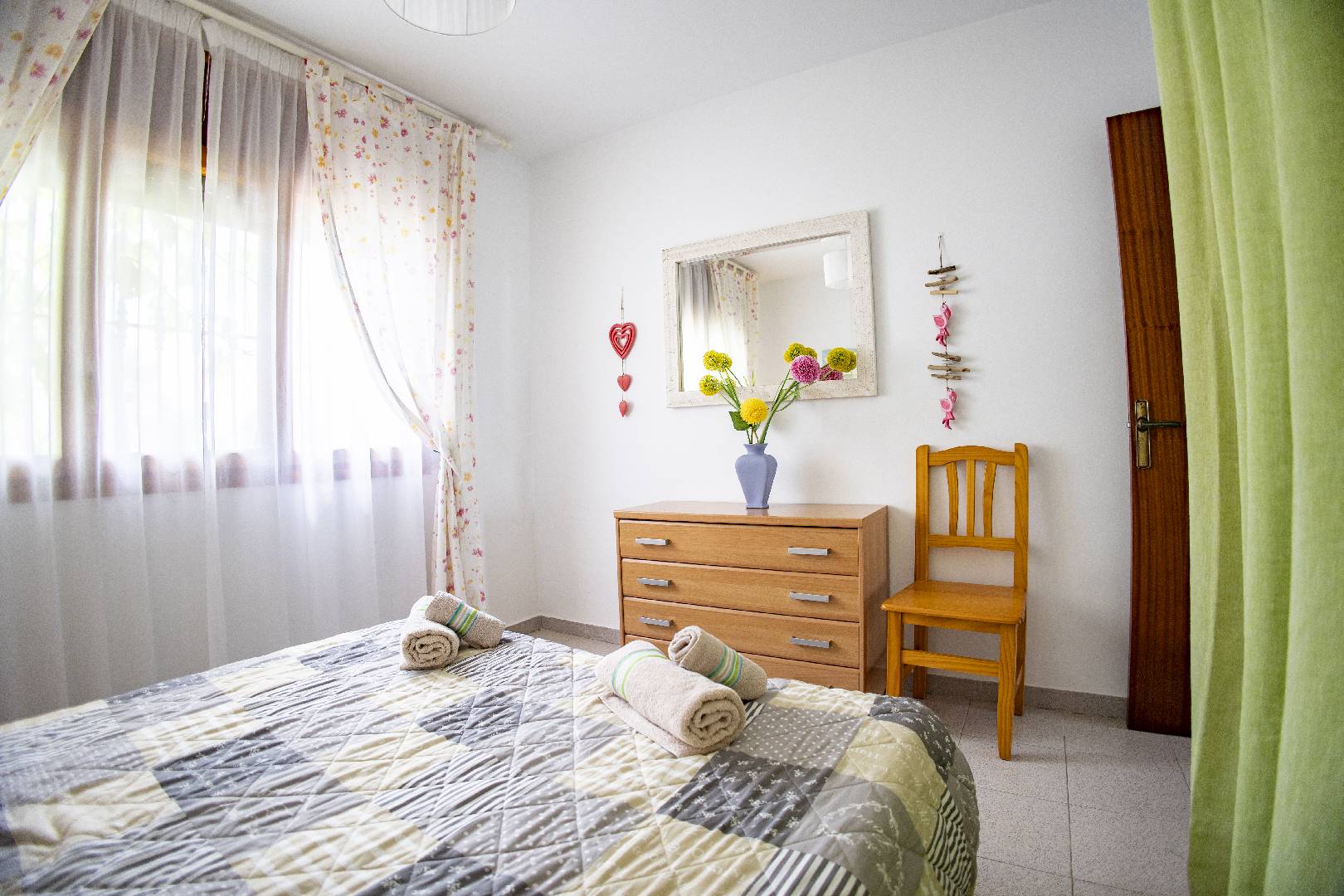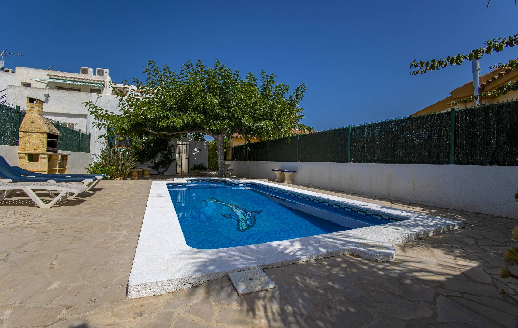 A su izquierda se encuentra zona del comedor con una mesa y sillas para 4 personas, televisión con satélite y aire acondicionado, cuyo uso es opcional. Desde la cocina americana, que está completamente equipada con todos los utensilios necesarios de cocina: vajilla, vitrocerámica, lavavajillas, microondas, etc.; se accede al lavadero/trastero, y de allí a la terraza trasera donde encontrara la piscina privada con zona de barbacoa. Desde el salón comedor, siguiendo el pasillo se encuentra el aseo con ducha recientemente reformado; el dormitorio con 2 camas individuales y al fondo, la habitación con cama de matrimonio. Ambos dormitorios disponen de armarios empotrados. El Chalet dispone de un pequeño solárium en la terraza superior donde podrá tomar el sol en tranquilidad. Todas las ventas disponen de rejas de seguridad y mosquiteras.