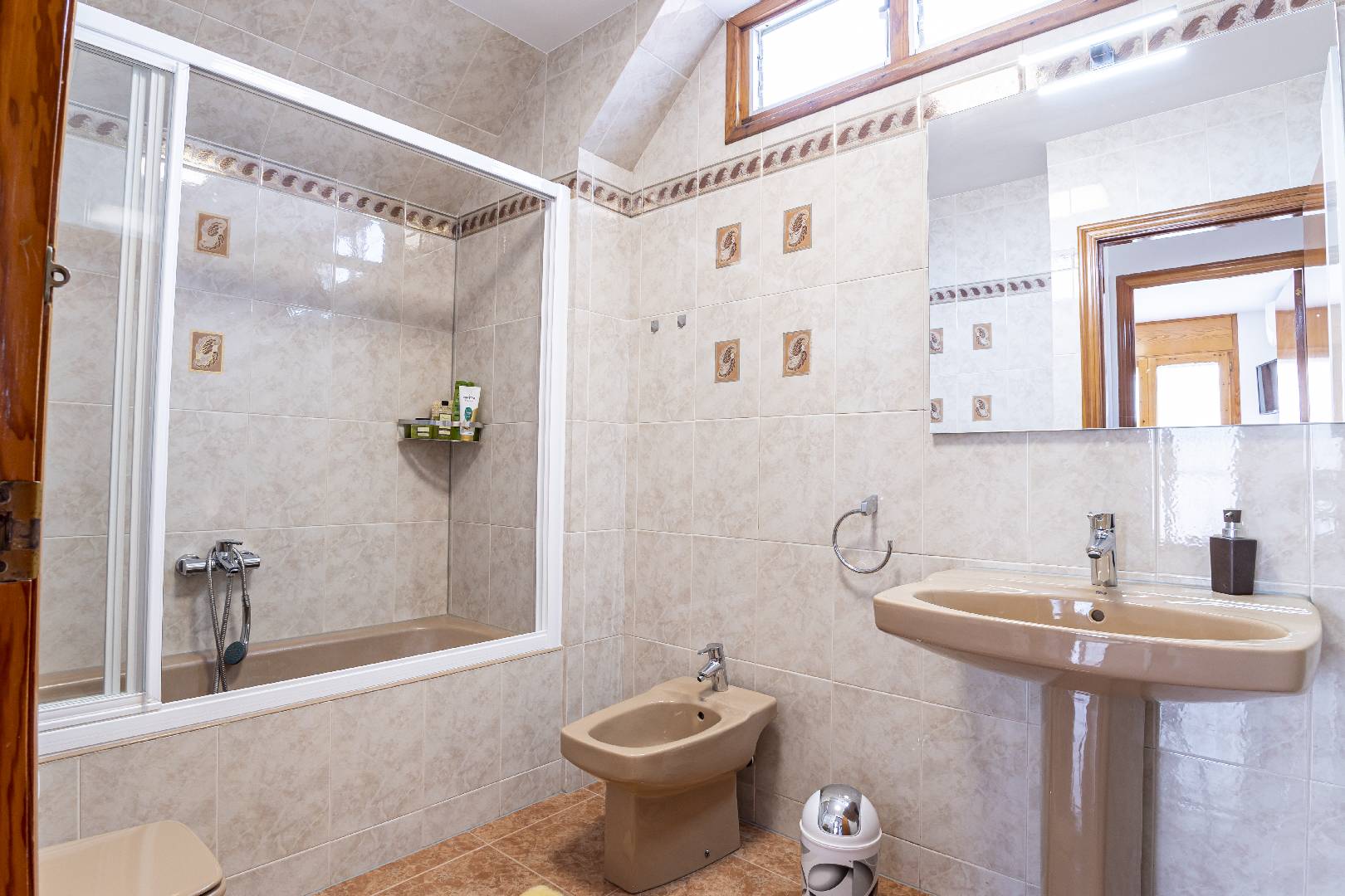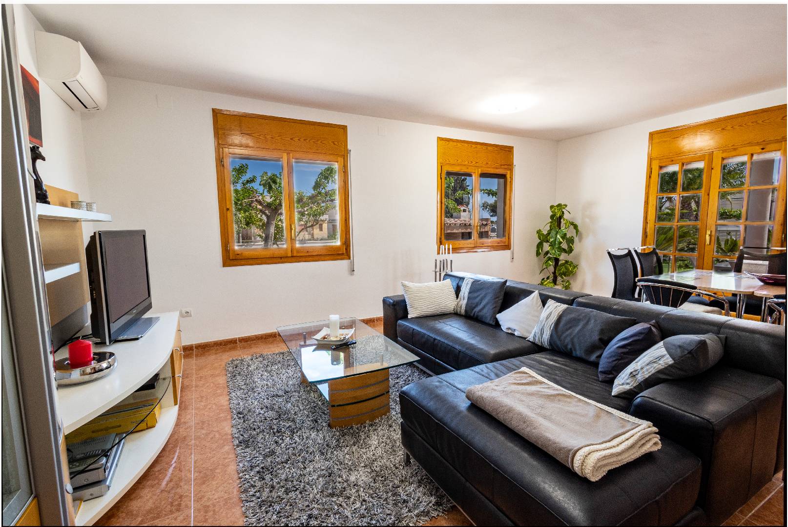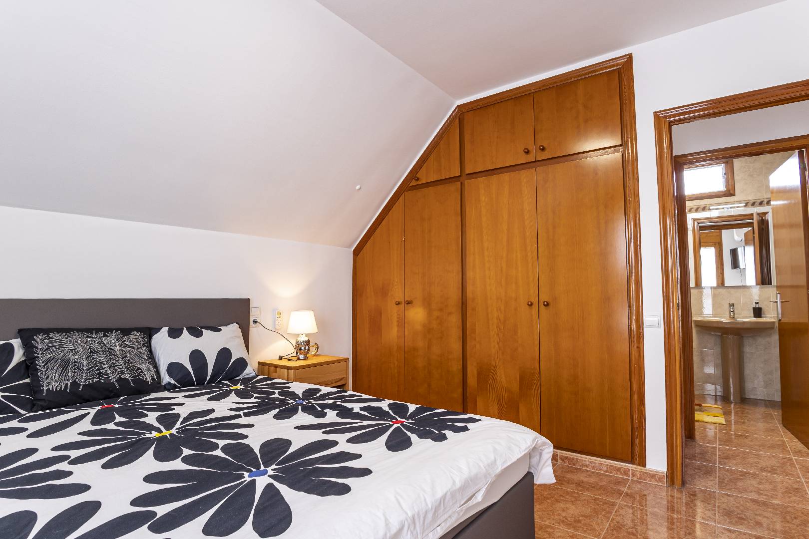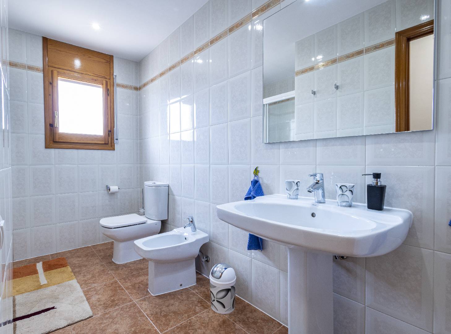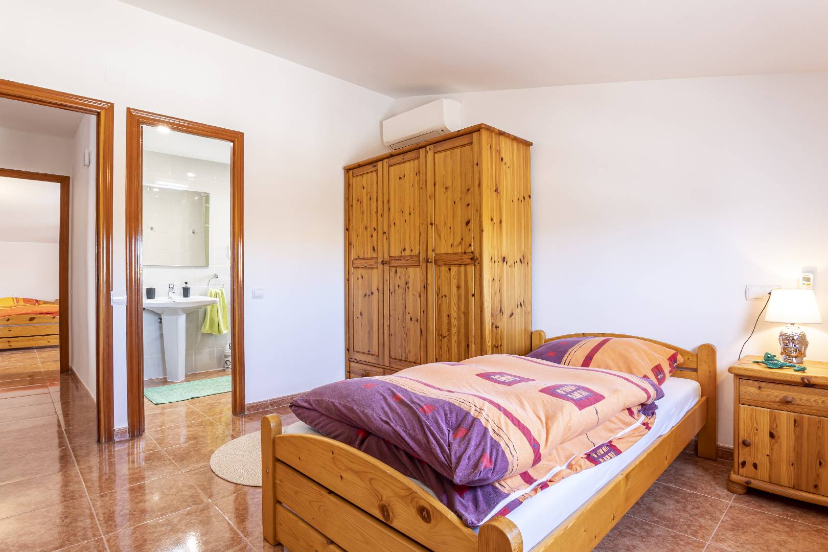 Entrando a mano izquierda se encuentra la primera habitación tipo suite que consta de un dormitorio con cama de matrimonio y armario ropero, enfrente hay un cuarto de baño con bañera; A la derecha de la entrada de la vivienda se encuentra un amplio salón-comedor con SAT-TV. Sus ventanas dan mucha luz natural y una puerta balconera da acceso directo a la terraza. Desde el pasillo central se accede a la cocina independiente con despensa, la misma dispone de una puerta a la parte trasera de la vivienda. Al fondo del pasillo existe un pequeño wc y al final el acceso al almacén donde se encuentra la lavadora. A través de unas escaleras situadas en el pasillo central le llevan a la primera planta donde hay dos dormitorios con una cama individual y un cuarto de baño privado cada uno. Subiendo a la segunda planta se encuentra a la derecha un cuarto de baño, enfrente de la escalera un dormitorio con cama de matrimonio y armario ropero y a la izquierda otro dormitorio, más amplio también con cama de matrimonio y armario ropero. Ambos dormitorios tienen mucha luz natural y a través de una puerta balconera se llega a la gran terraza solárium con vistas hacia el Rio Ebro, el Parque Natural y el jardín con la piscina de la villa.