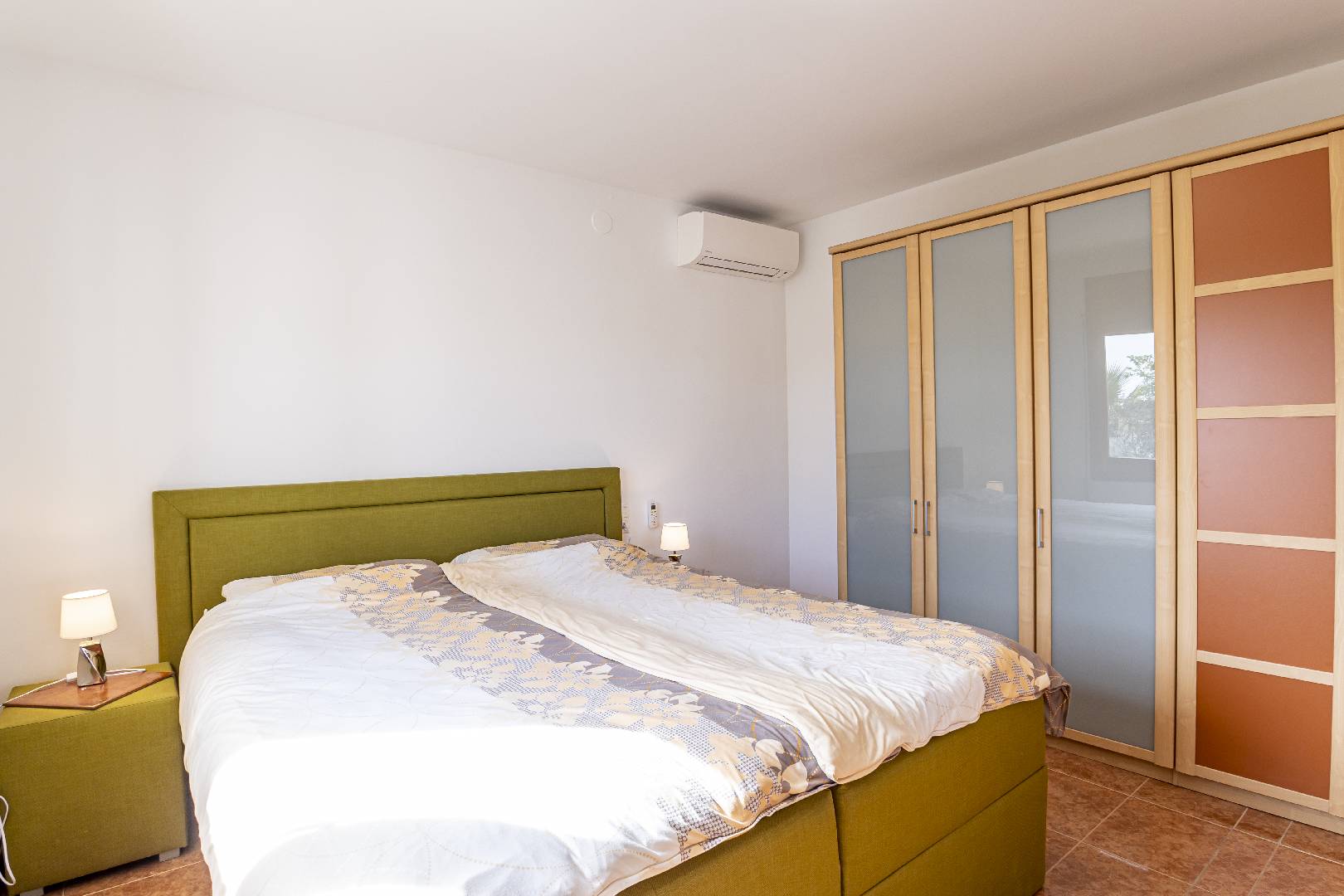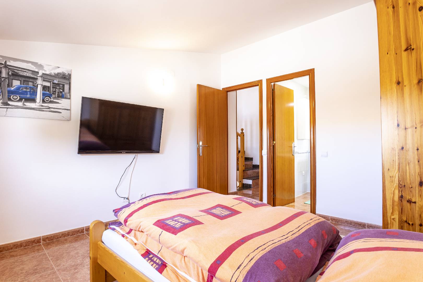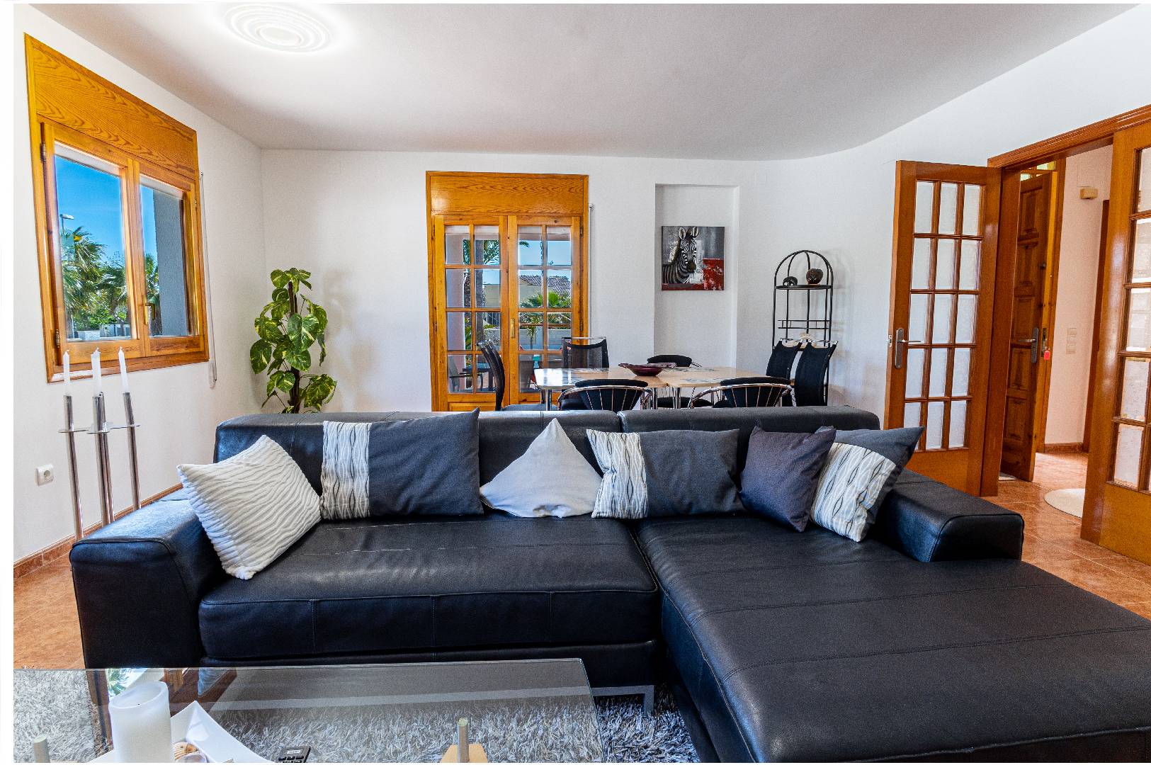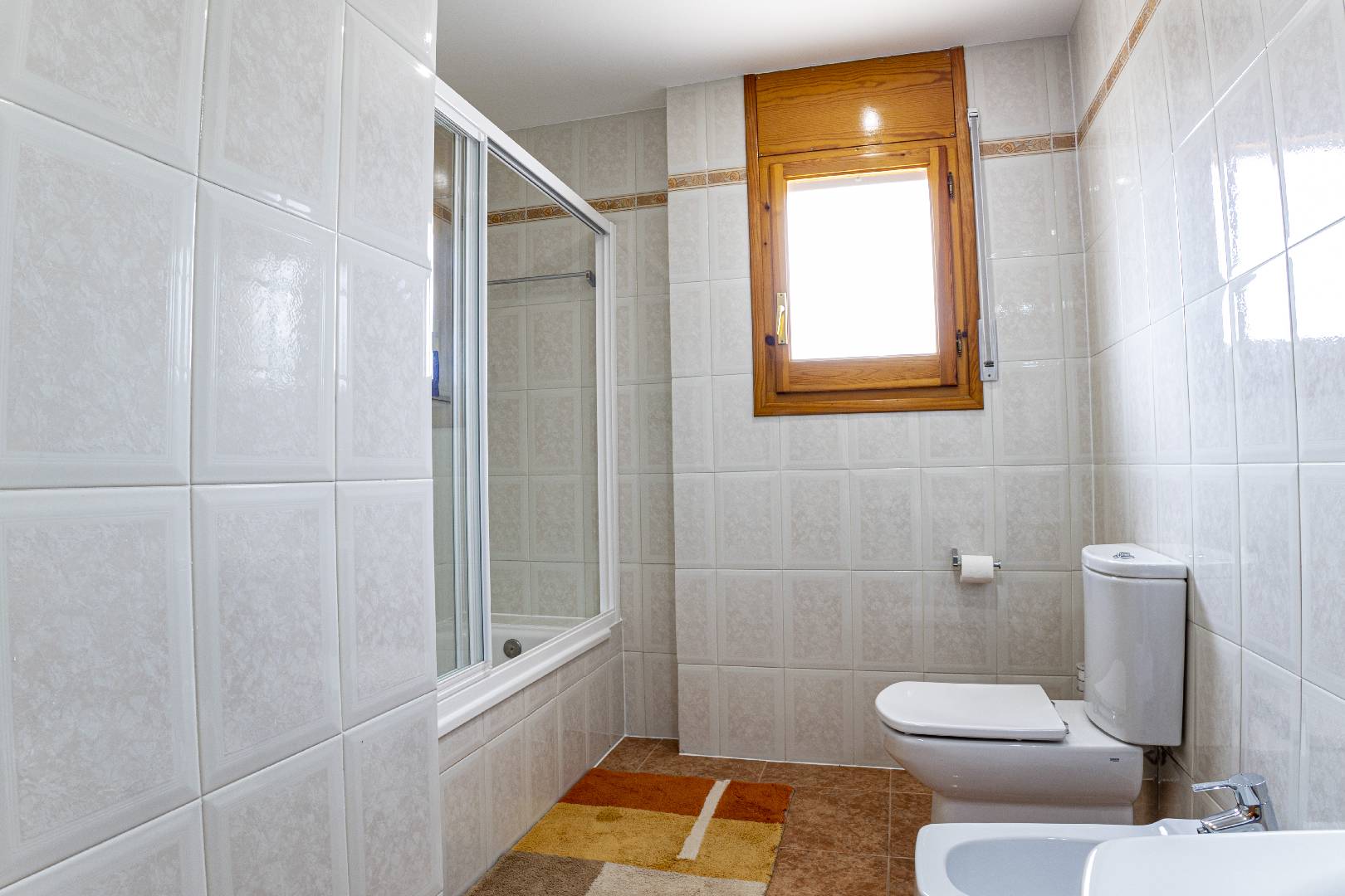 Entrando a mano izquierda se encuentra la primera habitación tipo suite que consta de un dormitorio con cama de matrimonio y armario ropero, enfrente hay un cuarto de baño con bañera; A la derecha de la entrada de la vivienda se encuentra un amplio salón-comedor con SAT-TV. Sus ventanas dan mucha luz natural y una puerta balconera da acceso directo a la terraza. Desde el pasillo central se accede a la cocina independiente con despensa, la misma dispone de una puerta a la parte trasera de la vivienda. Al fondo del pasillo existe un pequeño wc y al final el acceso al almacén donde se encuentra la lavadora. A través de unas escaleras situadas en el pasillo central le llevan a la primera planta donde hay dos dormitorios con una cama individual y un cuarto de baño privado cada uno. Subiendo a la segunda planta se encuentra a la derecha un cuarto de baño, enfrente de la escalera un dormitorio con cama de matrimonio y armario ropero y a la izquierda otro dormitorio, más amplio también con cama de matrimonio y armario ropero. Ambos dormitorios tienen mucha luz natural y a través de una puerta balconera se llega a la gran terraza solárium con vistas hacia el Rio Ebro, el Parque Natural y el jardín con la piscina de la villa.