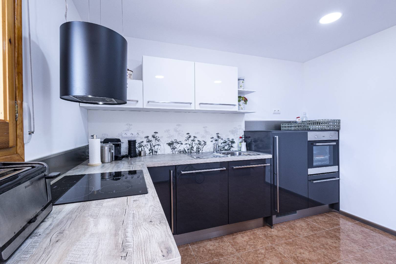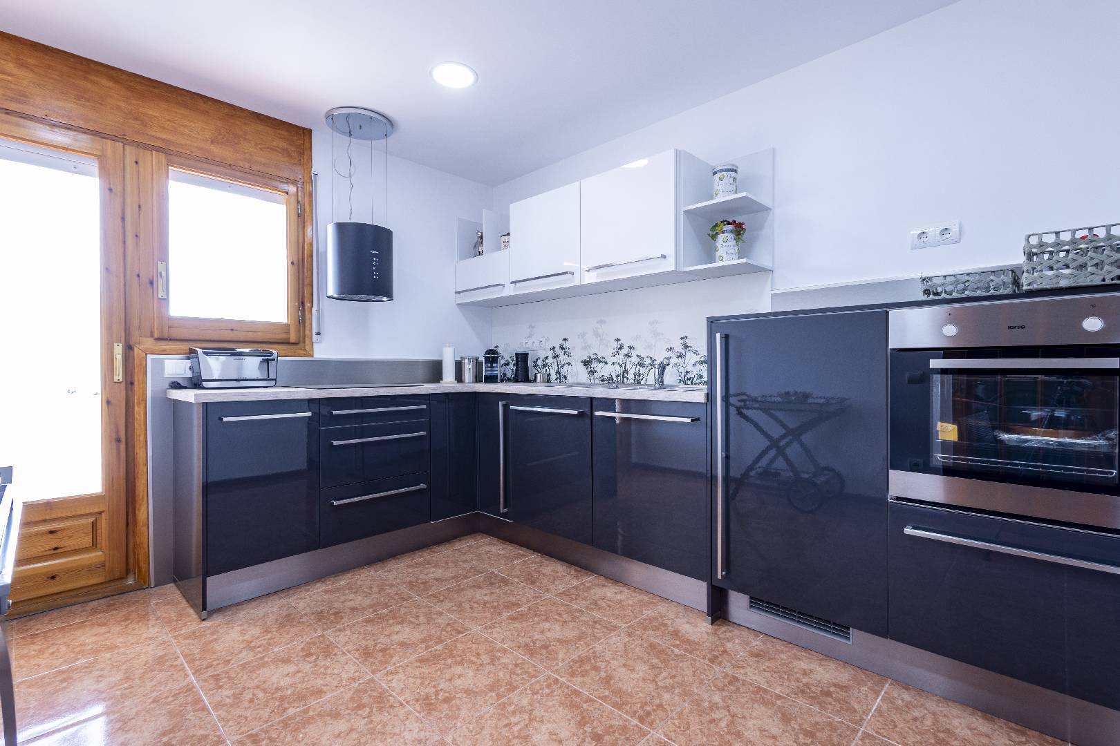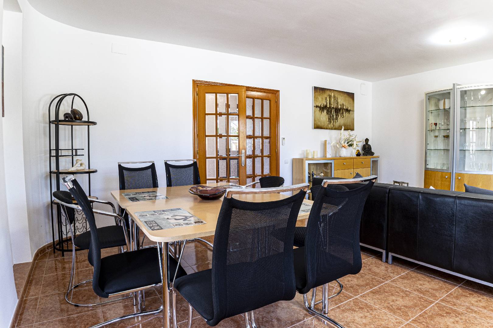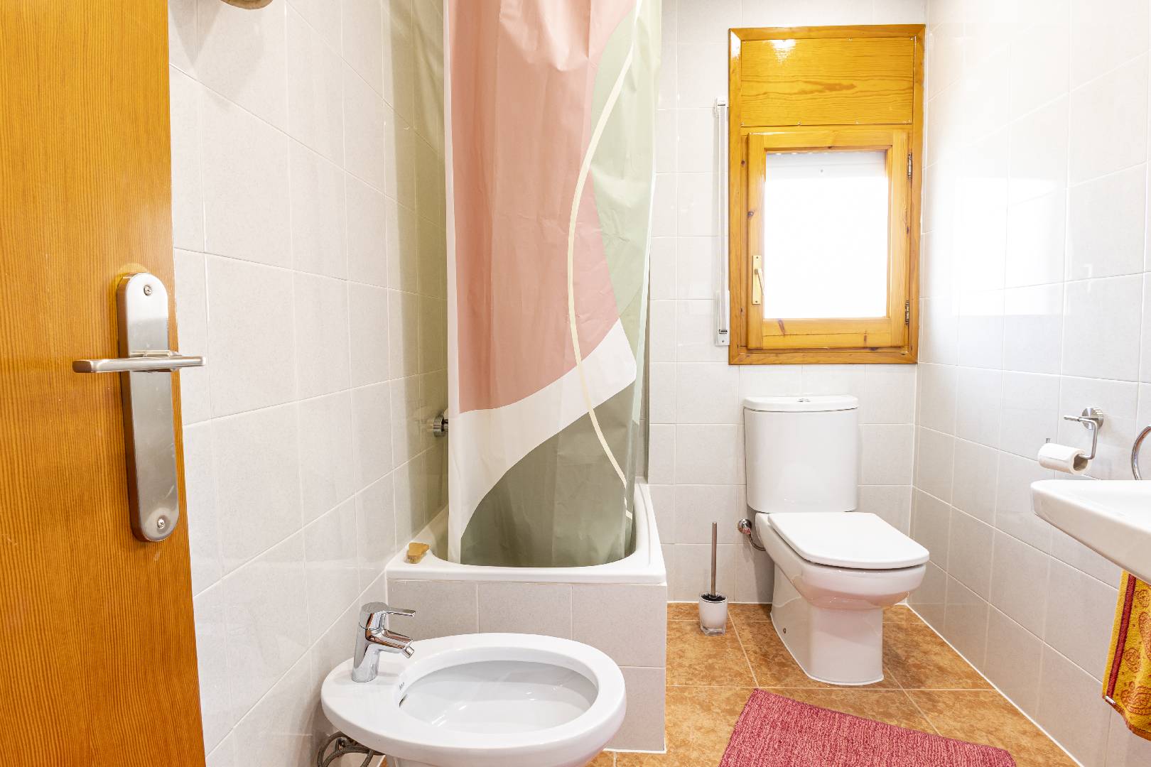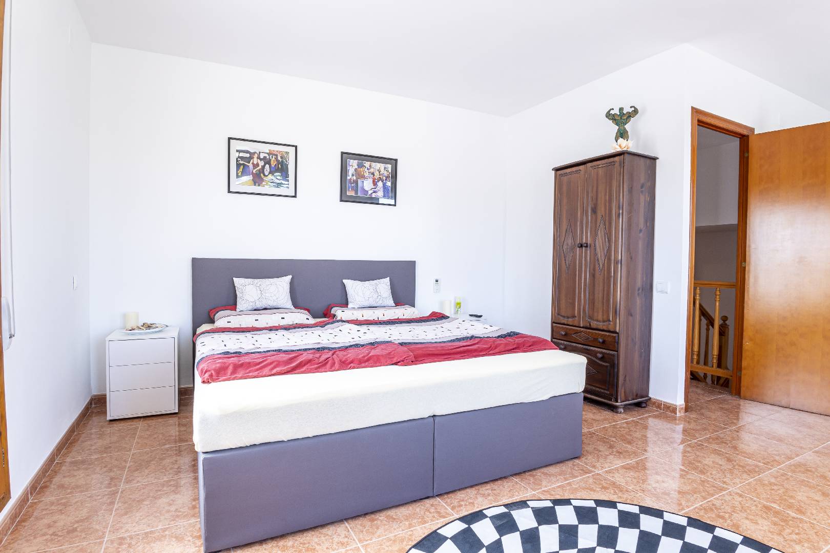 Entrando a mano izquierda se encuentra la primera habitación tipo suite que consta de un dormitorio con cama de matrimonio y armario ropero, enfrente hay un cuarto de baño con bañera; A la derecha de la entrada de la vivienda se encuentra un amplio salón-comedor con SAT-TV. Sus ventanas dan mucha luz natural y una puerta balconera da acceso directo a la terraza. Desde el pasillo central se accede a la cocina independiente con despensa, la misma dispone de una puerta a la parte trasera de la vivienda. Al fondo del pasillo existe un pequeño wc y al final el acceso al almacén donde se encuentra la lavadora. A través de unas escaleras situadas en el pasillo central le llevan a la primera planta donde hay dos dormitorios con una cama individual y un cuarto de baño privado cada uno. Subiendo a la segunda planta se encuentra a la derecha un cuarto de baño, enfrente de la escalera un dormitorio con cama de matrimonio y armario ropero y a la izquierda otro dormitorio, más amplio también con cama de matrimonio y armario ropero. Ambos dormitorios tienen mucha luz natural y a través de una puerta balconera se llega a la gran terraza solárium con vistas hacia el Rio Ebro, el Parque Natural y el jardín con la piscina de la villa.