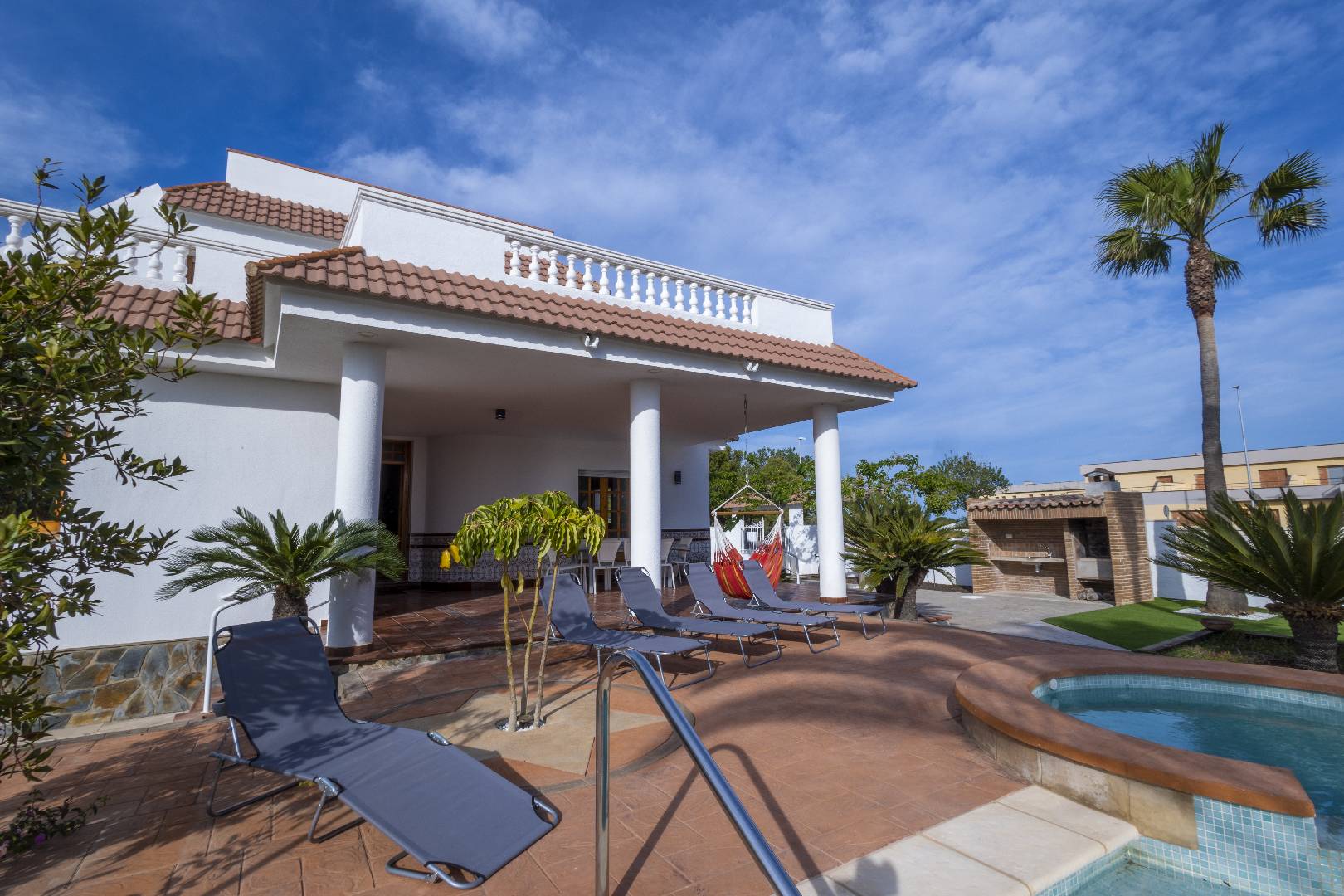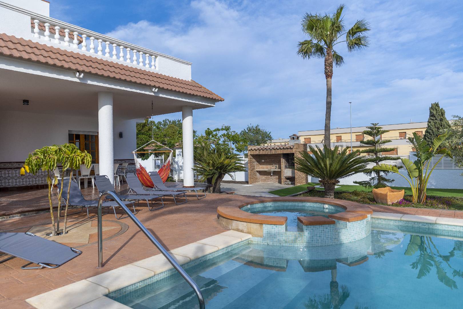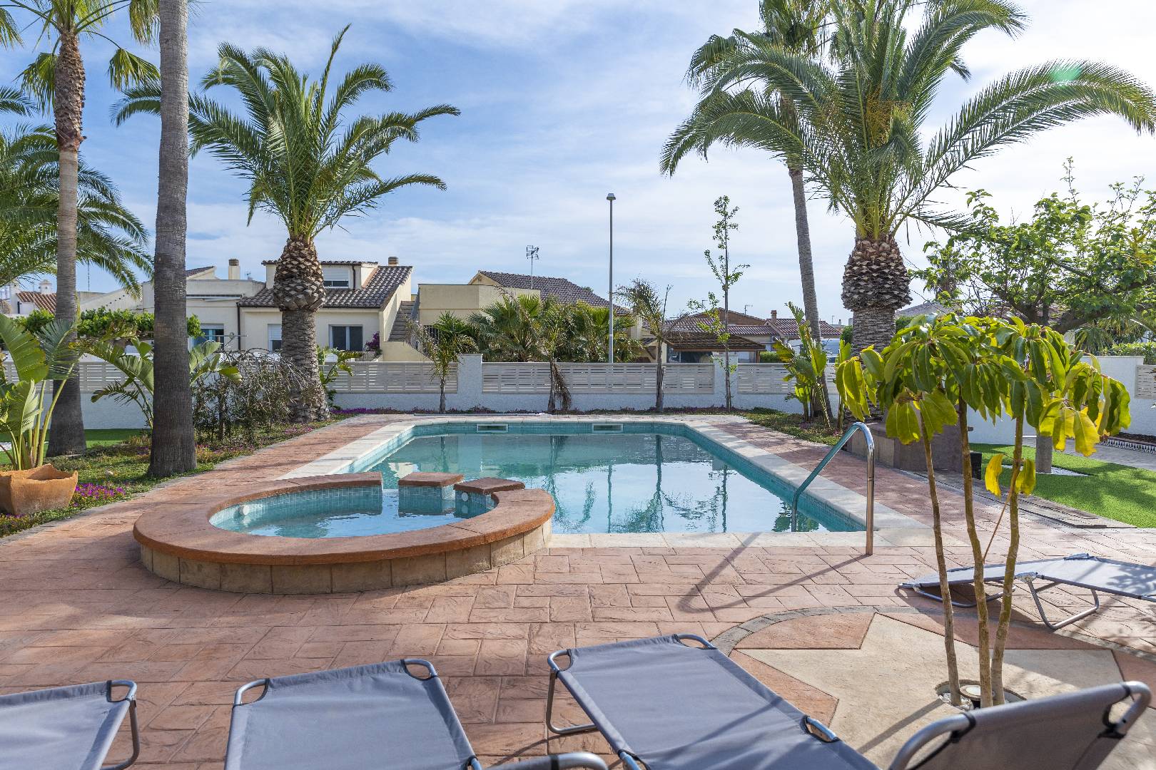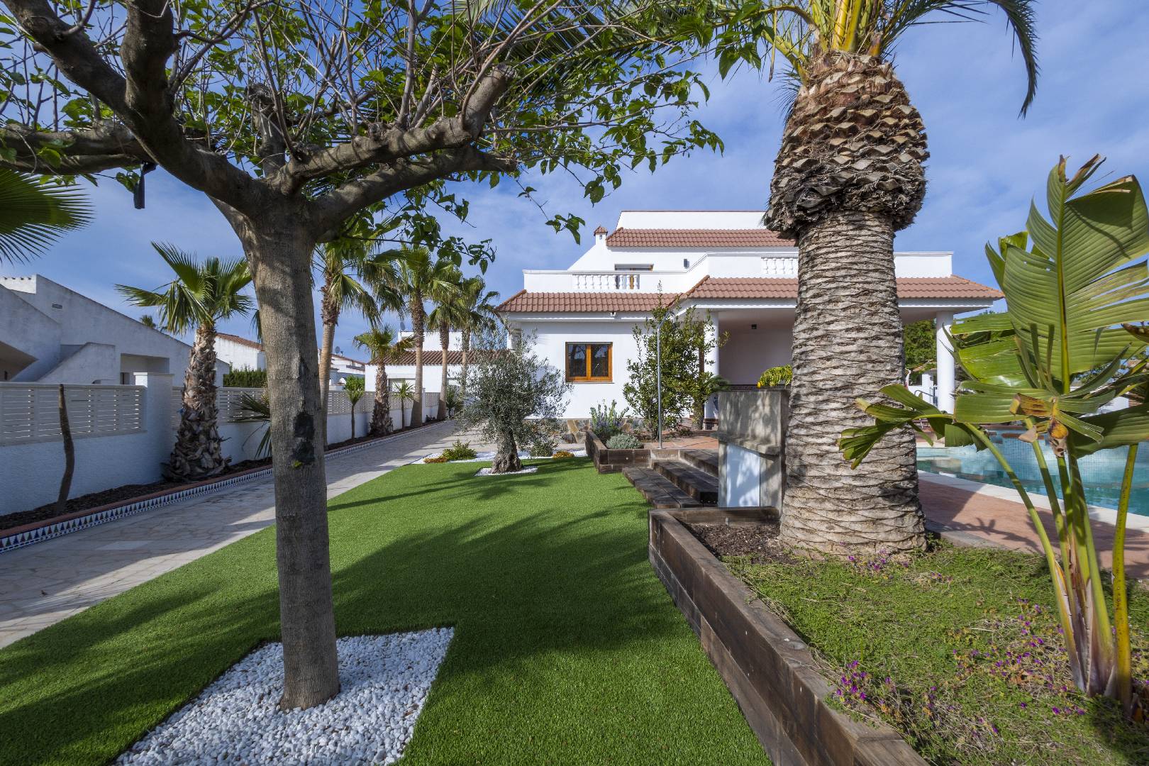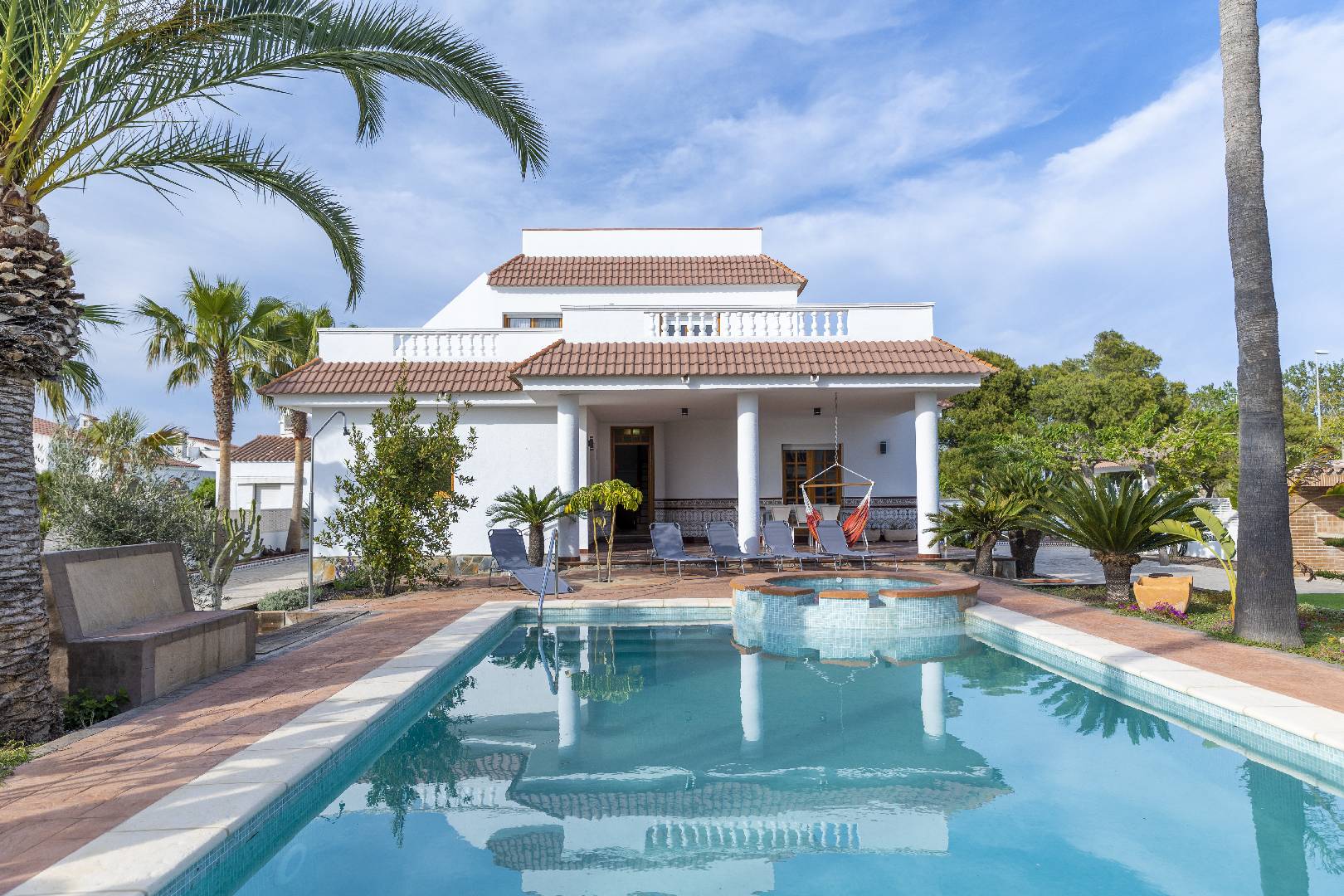 La zona del jardín y piscina dispone de mucha sombra de diversos árboles y palmeras, hay dos zonas de césped artificial, la piscina de 4m x 7,5m. con escalera de obra dispone de un jacuzzi.