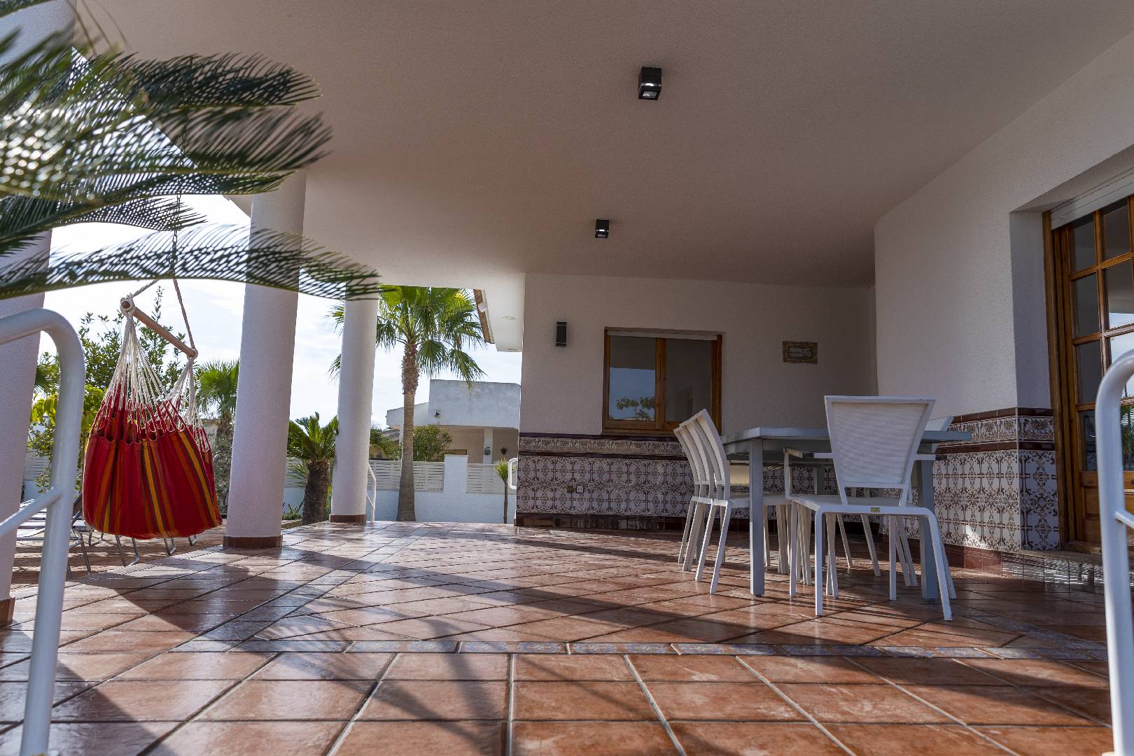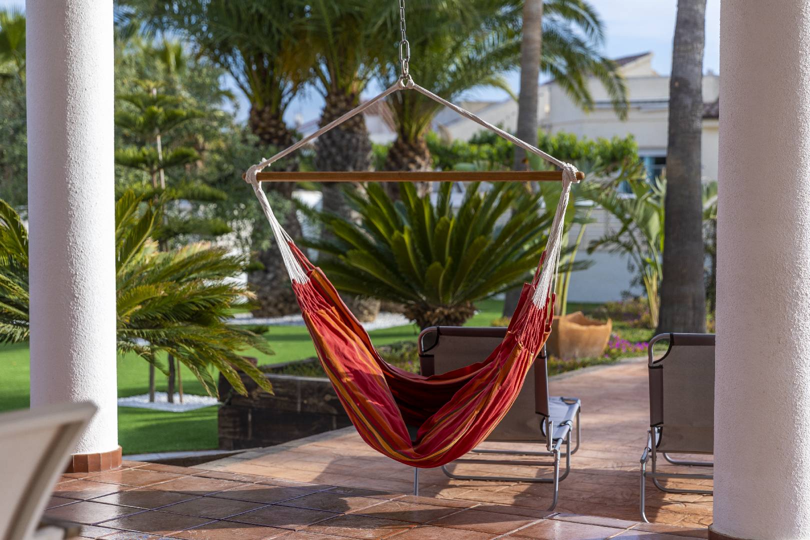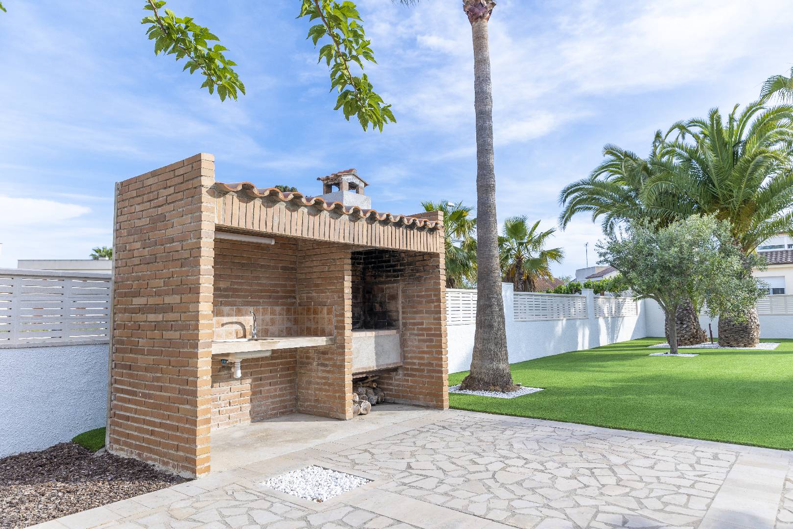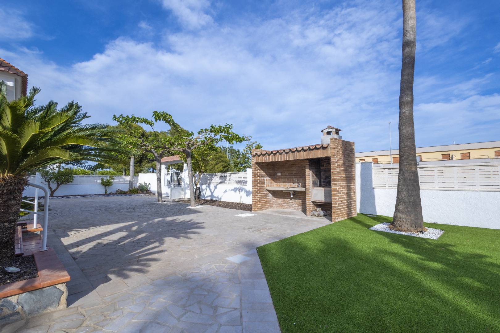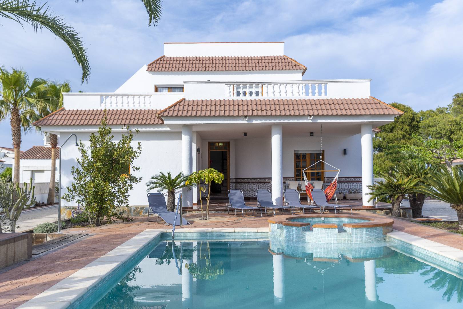 La zona del jardín y piscina dispone de mucha sombra de diversos árboles y palmeras, hay dos zonas de césped artificial, la piscina de 4m x 7,5m. con escalera de obra dispone de un jacuzzi.
